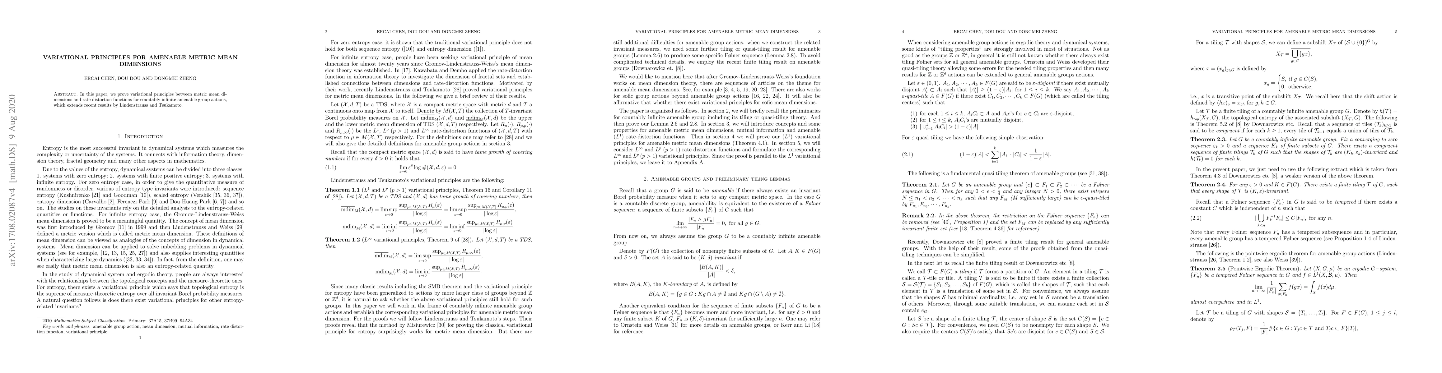 This paper establishes variational principles linking metric mean dimension and rate distortion function for actions of countable discrete amenable groups, extending prior findings by Lindenstrauss and Tsukamoto. The results provide deeper insights into the structure of such dynamical systems.