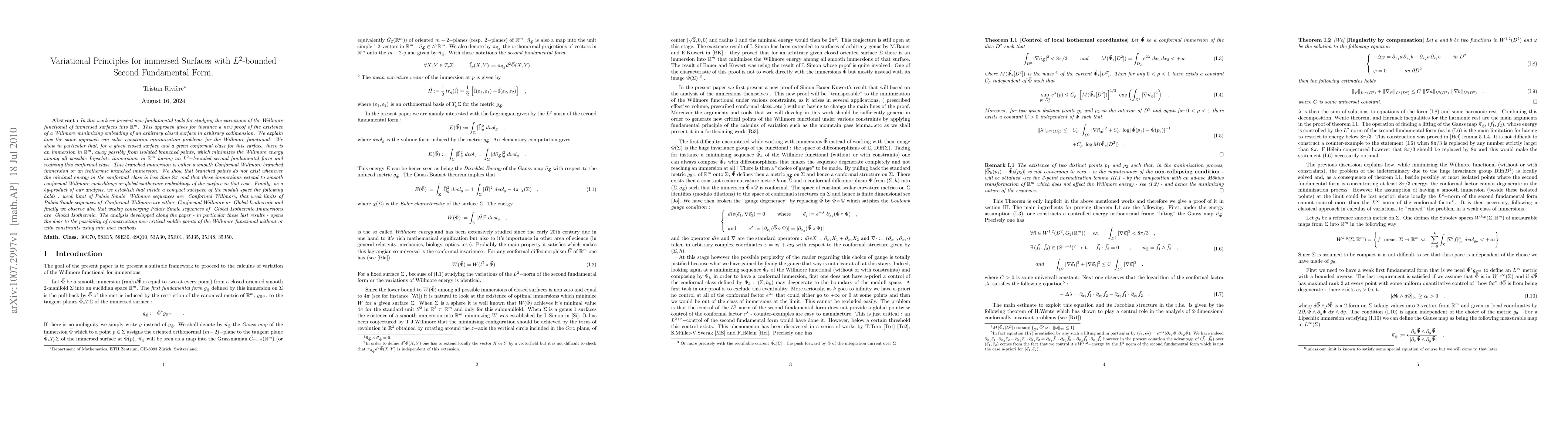 In this work we present new fundamental tools for studying the variations of the Willmore functional of immersed surfaces into $R^m$. This approach gives for instance a new proof of the existence of a Willmore minimizing embedding of an arbitrary closed surface in arbitrary codimension. We explain how the same approach can solve constraint minimization problems for the Willmore functional. We show in particular that, for a given closed surface and a given conformal class for this surface, there is an immersion in $R^m$, away possibly from isolated branched points, which minimizes the Willmore energy among all possible Lipschitz immersions in $R^m$ having an $L^2-$bounded second fundamental form and realizing this conformal class. This branched immersion is either a smooth Conformal Willmore branched immersion or an isothermic branched immersion. We show that branched points do not exist whenever the minimal energy in the conformal class is less than $8\pi$ and that these immersions extend to smooth conformal Willmore embeddings or global isothermic embeddings of the surface in that case. Finally, as a by-product of our analysis, we establish that inside a compact subspace of the moduli space the following holds : weak limit of Palais Smale Willmore sequences are Conformal Willmore, that weak limits of Palais Smale sequences of Conformal Willmore are either Conformal Willmore or Global Isothermic and finally we observe also that weakly converging Palais Smale sequences of Global Isothermic Immersions are Global Isothermic. The analysis developped along the paper - in particular these last results - opens the door to the possibility of constructing new critical saddle points of the Willmore functional without or with constraints using min max methods