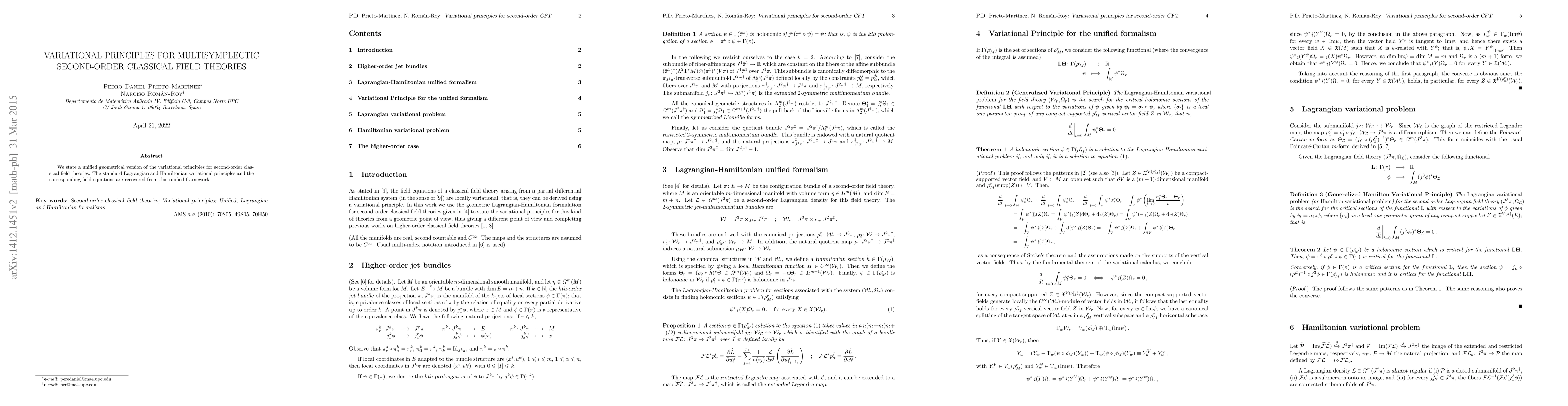 This paper presents a unified geometrical variational principle for second-order classical field theories, deriving both standard Lagrangian and Hamiltonian formulations and their respective field equations from this framework.