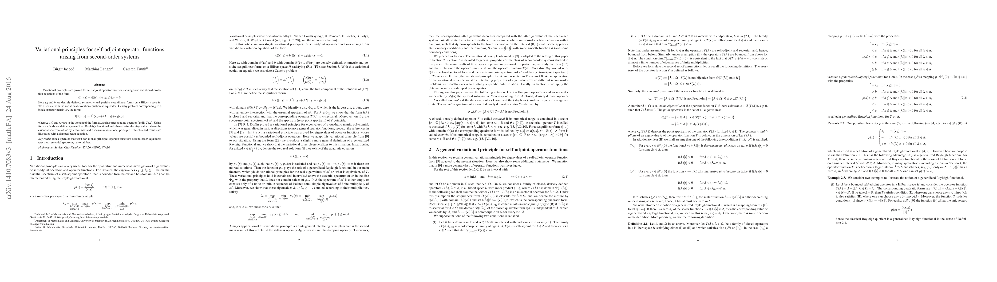 Variational principles are proved for self-adjoint operator functions arising from variational evolution equations of the form \[ \langle\ddot{z}(t),y \rangle + \mathfrak{d}[\dot{z} (t), y] + \mathfrak{a}_0 [z(t),y] = 0. \] Here $\mathfrak{a}_0$ and $\mathfrak{d}$ are densely defined, symmetric and positive sesquilinear forms on a Hilbert space $H$. We associate with the variational evolution equation an equivalent Cauchy problem corresponding to a block operator matrix $\mathcal{A}$, the forms \[ \mathfrak{t}(\lambda)[x,y] := \lambda^2\langle x,y\rangle + \lambda\mathfrak{d}[x,y] + \mathfrak{a}_0[x,y], \] where $\lambda\in \mathbb C$ and $x,y$ are in the domain of the form $\mathfrak{a}_0$, and a corresponding operator family $T(\lambda)$. Using form methods we define a generalized Rayleigh functional and characterize the eigenvalues above the essential spectrum of $\mathcal{A}$ by a min-max and a max-min variational principle. The obtained results are illustrated with a damped beam equation.