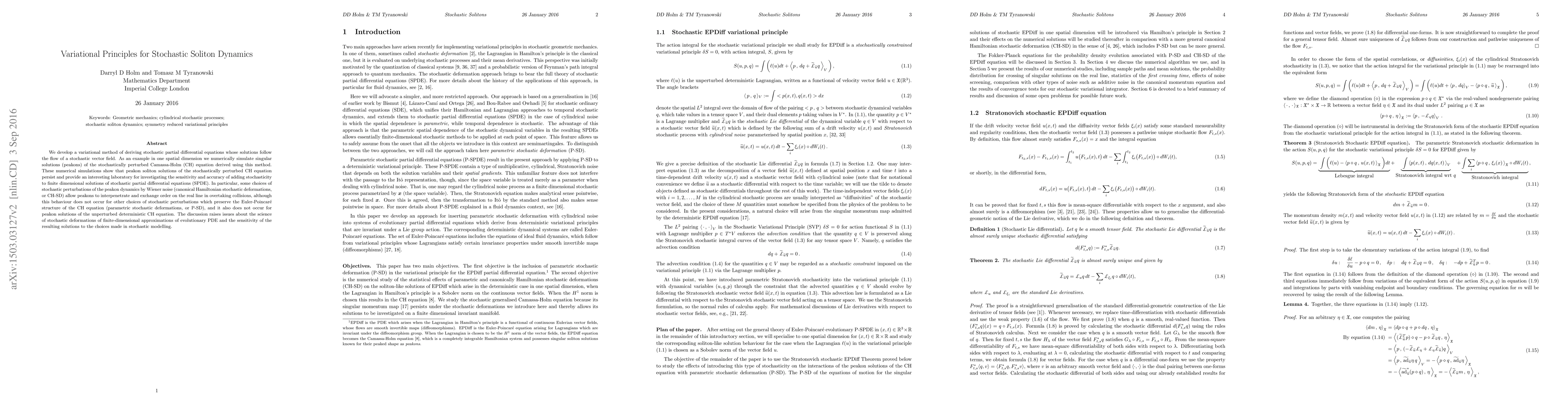 The paper introduces a variational principle for deriving stochastic PDEs and demonstrates its application through numerical simulations of peakon solutions under various stochastic perturbations.