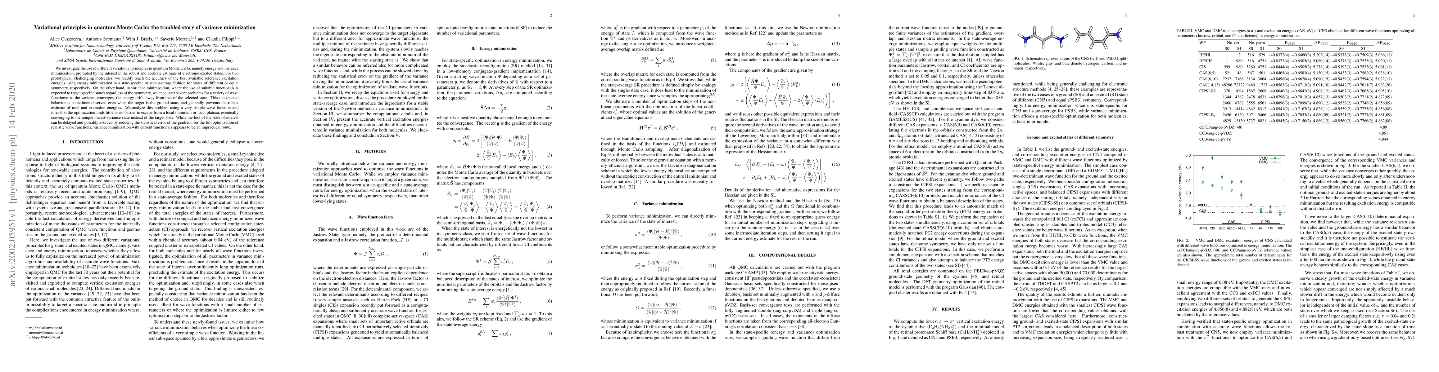 We investigate the use of different variational principles in quantum Monte Carlo, namely energy and variance minimization, prompted by the interest in the robust and accurate estimate of electronic excited states. For two prototypical, challenging molecules, we readily reach the accuracy of the best available reference excitation energies using energy minimization in a state-specific or state-average fashion for states of different or equal symmetry, respectively. On the other hand, in variance minimization, where the use of suitable functionals is expected to target specific states regardless of the symmetry, we encounter severe problems for a variety of wave functions: as the variance converges, the energy drifts away from that of the selected state. This unexpected behavior is sometimes observed even when the target is the ground state, and generally prevents the robust estimate of total and excitation energies. We analyze this problem using a very simple wave function and infer that the optimization finds little or no barrier to escape from a local minimum or local plateau, eventually converging to the unique lowest-variance state instead of the target state. While the loss of the state of interest can be delayed and possibly avoided by reducing the statistical error of the gradient, for the full optimization of realistic wave functions, variance minimization with current functionals appears to be an impractical route.
