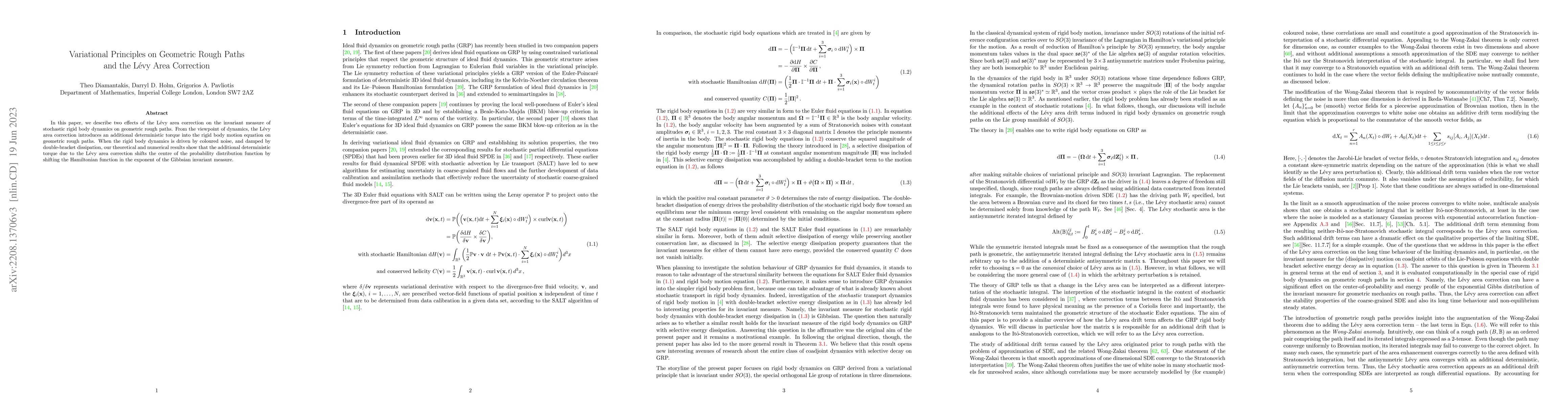 In this paper, we describe two effects of the L\'evy area correction on the invariant measure of stochastic rigid body dynamics on geometric rough paths. From the viewpoint of dynamics, the L\'evy area correction introduces an additional deterministic torque into the rigid body motion equation on geometric rough paths. When the dynamics is driven by coloured noise, and for rigid body dynamics with double-bracket dissipation, theoretical and numerical results show that this additional deterministic torque shifts the centre of the probability distribution function by shifting the Hamiltonian function in the exponent of the Gibbsian invariant measure.