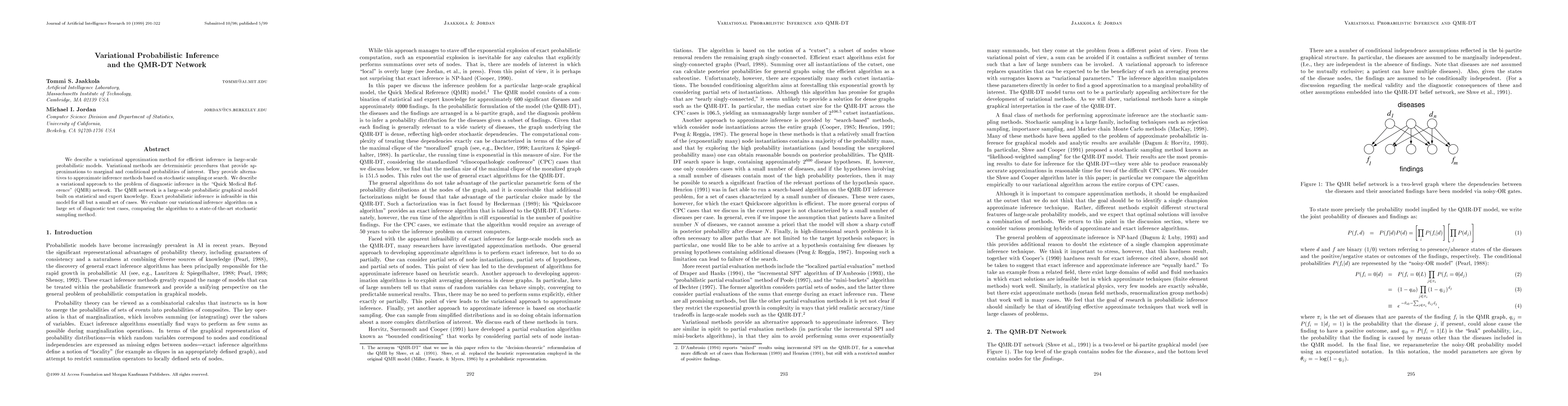 This paper introduces a variational approximation method for efficient inference in large-scale probabilistic models, specifically applied to the `Quick Medical Reference' (QMR) network. The authors compare their variational inference algorithm to a state-of-the-art stochastic sampling method on a large set of diagnostic test cases.