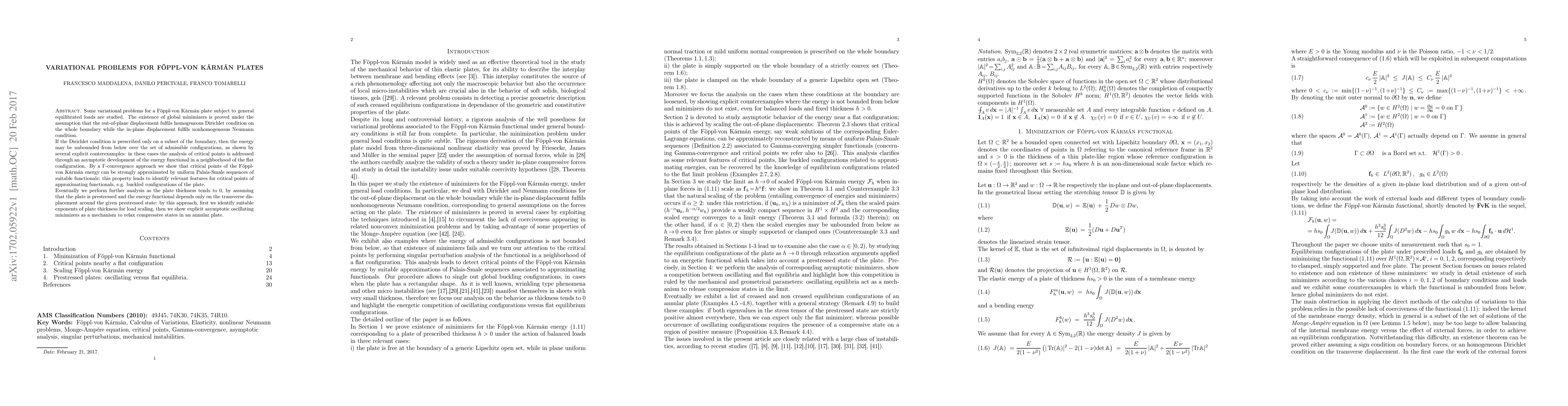 This paper studies variational problems for Foppl-von Karman plates under general loads, proving the existence of global minimizers under specific boundary conditions. It also explores cases where the energy is unbounded and uses $\Gamma$-convergence to identify buckled configurations in critical points.