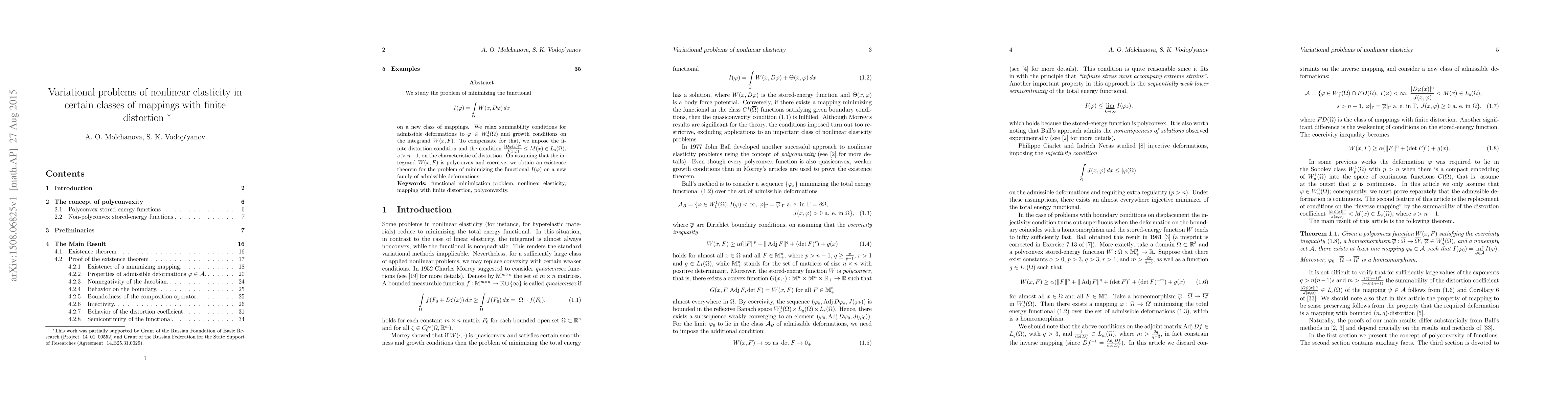 We study the problem of minimizing the functional $$ I(\varphi)=\int\limits_{\Omega} W(x,D\varphi)\,dx $$ on a new class of mappings. We relax summability conditions for admissible deformations to $\varphi\in W^1_n(\Omega)$ and growth conditions on the integrand $W(x,F)$. To compensate for that, we impose the finite distortion condition and the condition $\frac{|D\varphi(x)|^n}{J(x,\varphi)} \leq M(x) \in L_{s}(\Omega)$, $s>n-1$, on the characteristic of distortion. On assuming that the integrand $W(x,F)$ is polyconvex and coercive, we obtain an~existence theorem for the problem of minimizing the functional $I(\varphi)$ on a new family of admissible deformations. KEYWORDS: functional minimization problem, nonlinear elasticity, mapping with finite distortion, polyconvexity.