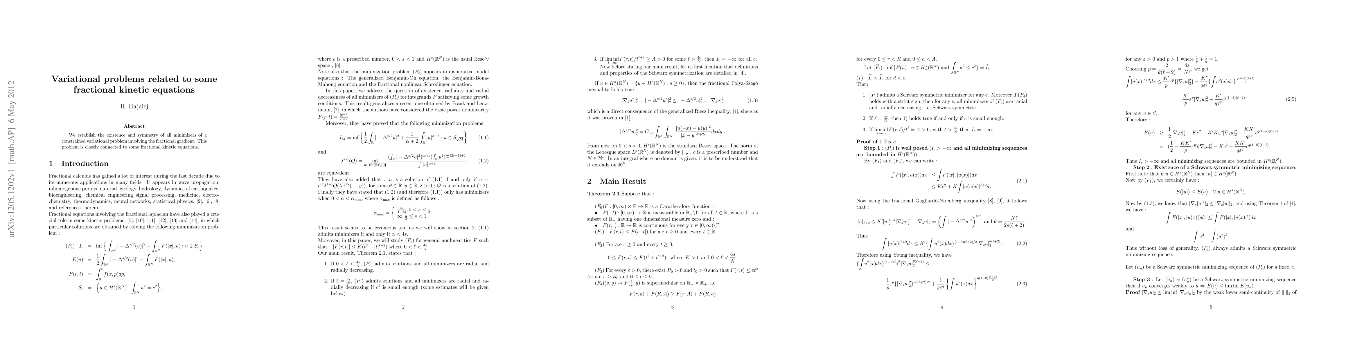 We establish the existence and symmetry of all minimizers of a constrained variational problem involving the fractional gradient. This problem is closely connected to some fractional kinetic equations.