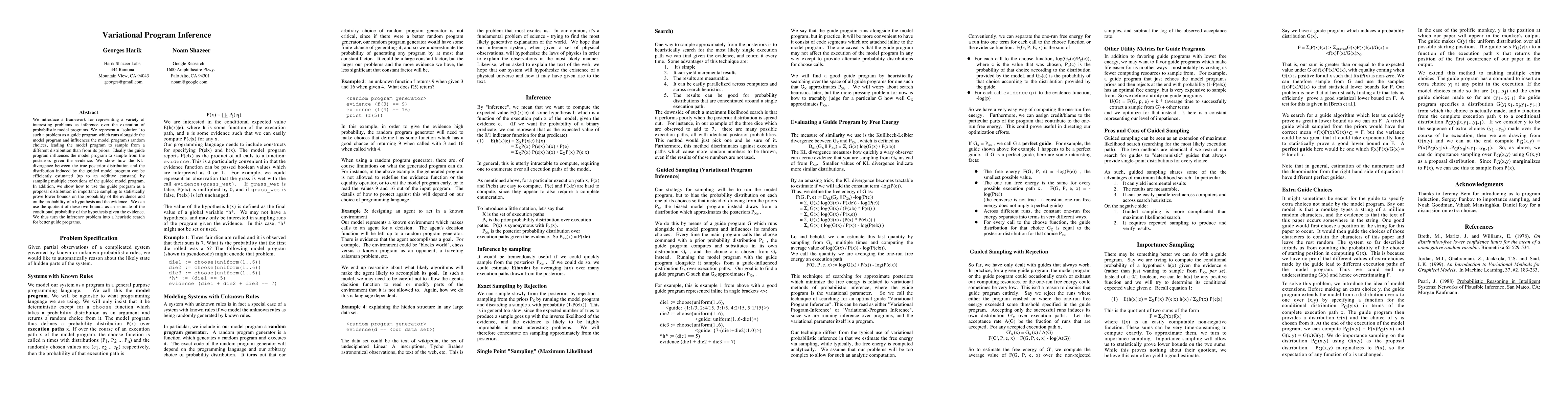 We introduce a framework for representing a variety of interesting problems as inference over the execution of probabilistic model programs. We represent a "solution" to such a problem as a guide program which runs alongside the model program and influences the model program's random choices, leading the model program to sample from a different distribution than from its priors. Ideally the guide program influences the model program to sample from the posteriors given the evidence. We show how the KL- divergence between the true posterior distribution and the distribution induced by the guided model program can be efficiently estimated (up to an additive constant) by sampling multiple executions of the guided model program. In addition, we show how to use the guide program as a proposal distribution in importance sampling to statistically prove lower bounds on the probability of the evidence and on the probability of a hypothesis and the evidence. We can use the quotient of these two bounds as an estimate of the conditional probability of the hypothesis given the evidence. We thus turn the inference problem into a heuristic search for better guide programs.