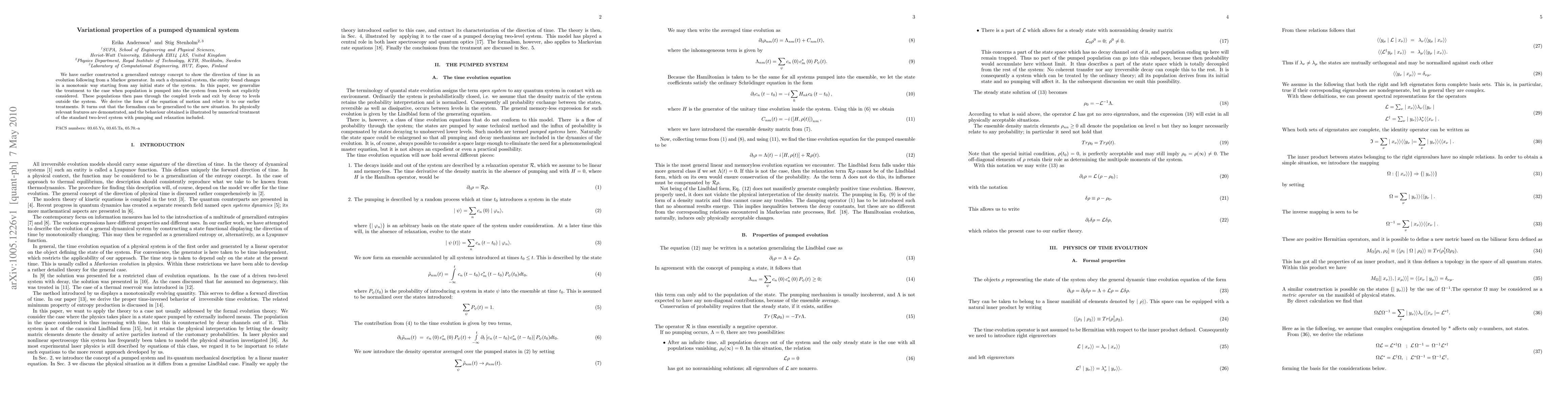 We have earlier constructed a generalized entropy concept to show the direction of time in an evolution following from a Markov generator. In such a dynamical system, the entity found changes in a monotonic way starting from any initial state of the system. In this paper, we generalize the treatment to the case when population is pumped into the system from levels not explicitly considered. These populations then pass through the coupled levels and exit by decay to levels outside the system. We derive the form of the equation of motion and relate it to our earlier treatments. It turns out that the formalism can be generalized to the new situation. Its physically relevant features are demonstrated, and the behaviour obtained is illustrated by numerical treatment of the standard two-level system with pumping and relaxation included.