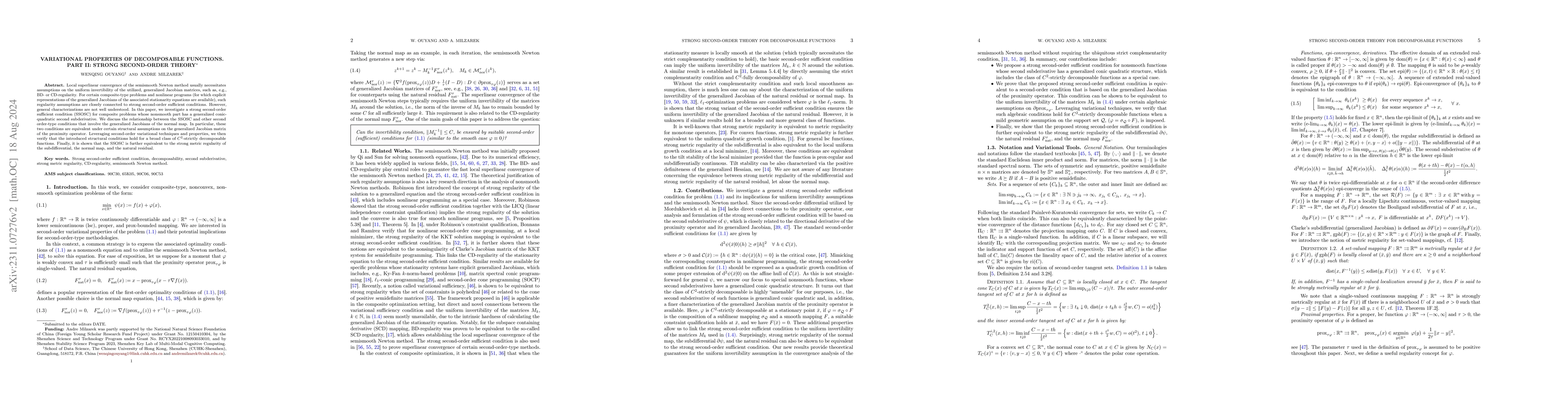 Local superlinear convergence of the semismooth Newton method usually requires the uniform invertibility of the generalized Jacobian matrix, e.g. BD-regularity or CD-regularity. For several types of nonlinear programming and composite-type optimization problems -- for which the generalized Jacobian of the stationary equation can be calculated explicitly -- this is characterized by the strong second-order sufficient condition. However, general characterizations are still not well understood. In this paper, we propose a strong second-order sufficient condition (SSOSC) for composite problems whose nonsmooth part has a generalized conic-quadratic second subderivative. We then discuss the relationship between the SSOSC and another second order-type condition that involves the generalized Jacobians of the normal map. In particular, these two conditions are equivalent under certain structural assumptions on the generalized Jacobian matrix of the proximity operator. Next, we verify these structural assumptions for $C^2$-strictly decomposable functions via analyzing their second-order variational properties under additional geometric assumptions on the support set of the decomposition pair. Finally, we show that the SSOSC is further equivalent to the strong metric regularity condition of the subdifferential, the normal map, and the natural residual. Counterexamples illustrate the necessity of our assumptions.