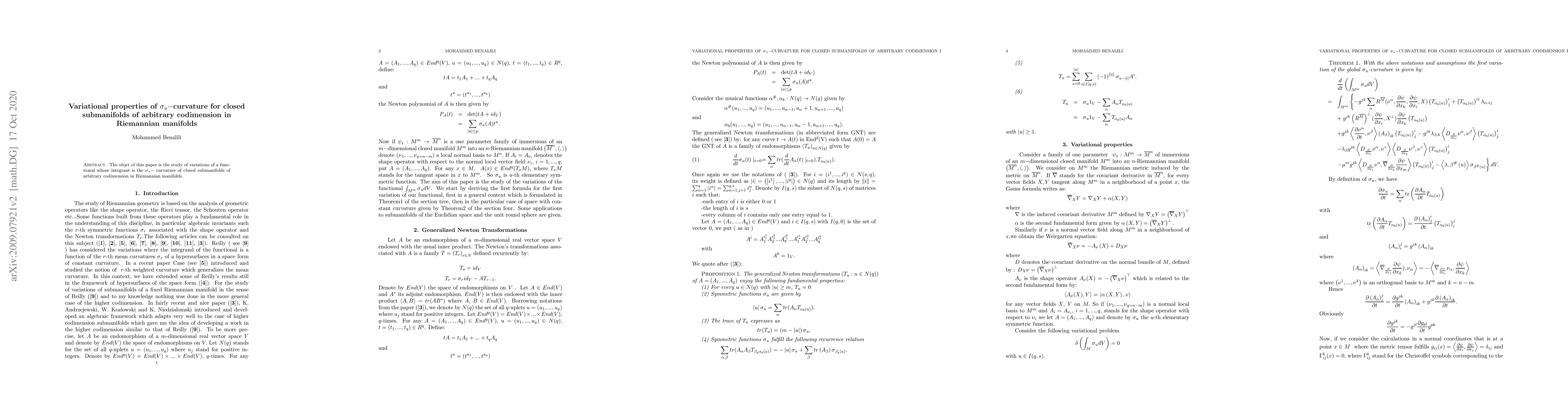 The objet of this paper is the study of variations of a functional whose integrant is the $\sigma_u$-curvature of closed submanifolds of arbitrary codimension in Riemannian manifolds.