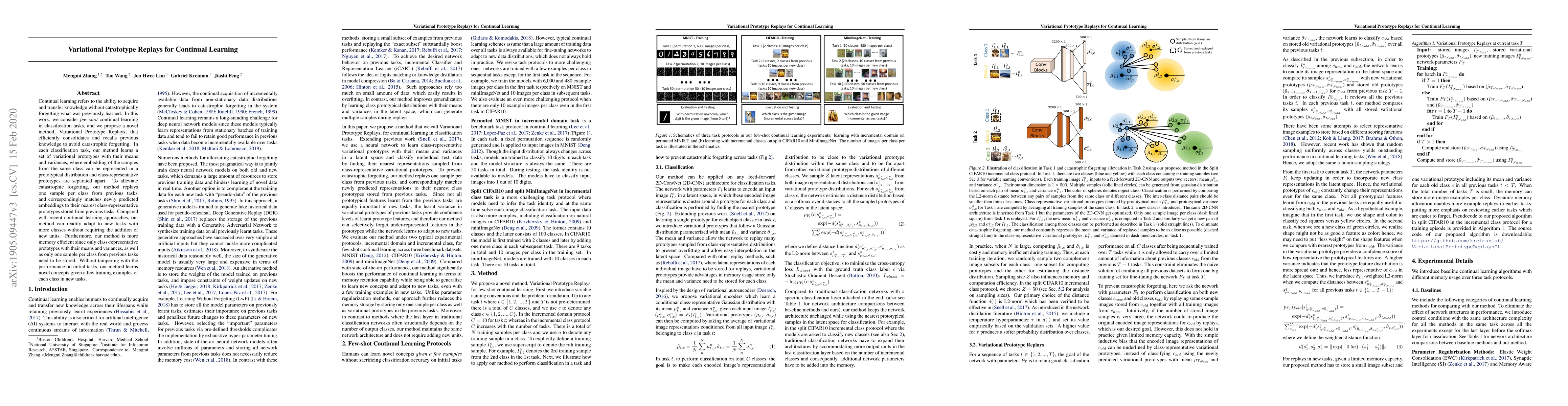 This paper proposes Variational Prototype Replays for few-shot continual learning, which uses variational prototypes to consolidate and recall previous knowledge, minimizing catastrophic forgetting. The method efficiently adapts to new tasks with minimal memory requirements by storing only class-representative prototypes and one sample per class from previous tasks.