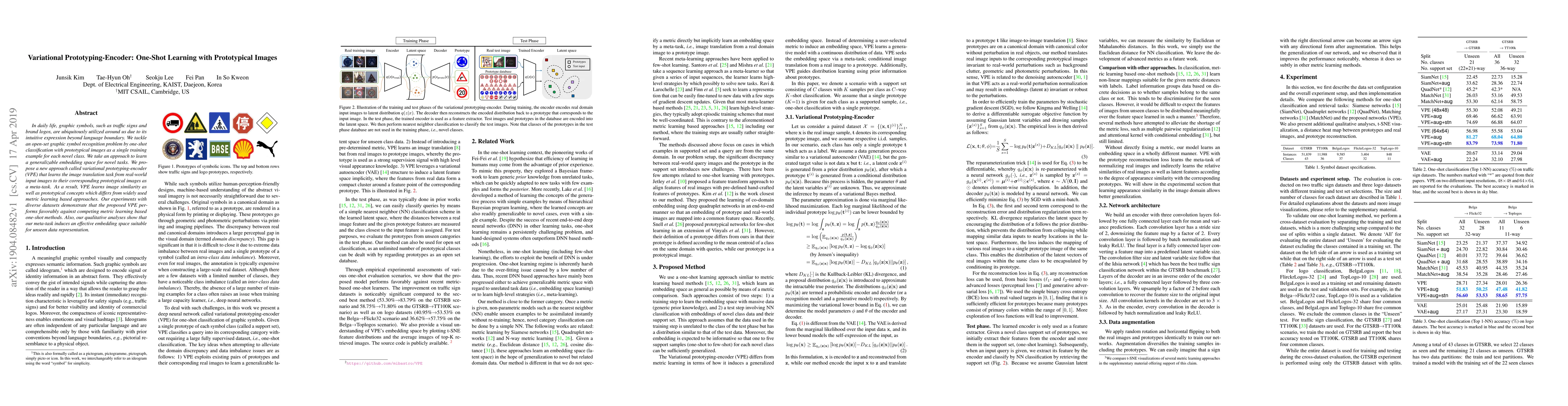In daily life, graphic symbols, such as traffic signs and brand logos, are ubiquitously utilized around us due to its intuitive expression beyond language boundary. We tackle an open-set graphic symbol recognition problem by one-shot classification with prototypical images as a single training example for each novel class. We take an approach to learn a generalizable embedding space for novel tasks. We propose a new approach called variational prototyping-encoder (VPE) that learns the image translation task from real-world input images to their corresponding prototypical images as a meta-task. As a result, VPE learns image similarity as well as prototypical concepts which differs from widely used metric learning based approaches. Our experiments with diverse datasets demonstrate that the proposed VPE performs favorably against competing metric learning based one-shot methods. Also, our qualitative analyses show that our meta-task induces an effective embedding space suitable for unseen data representation.