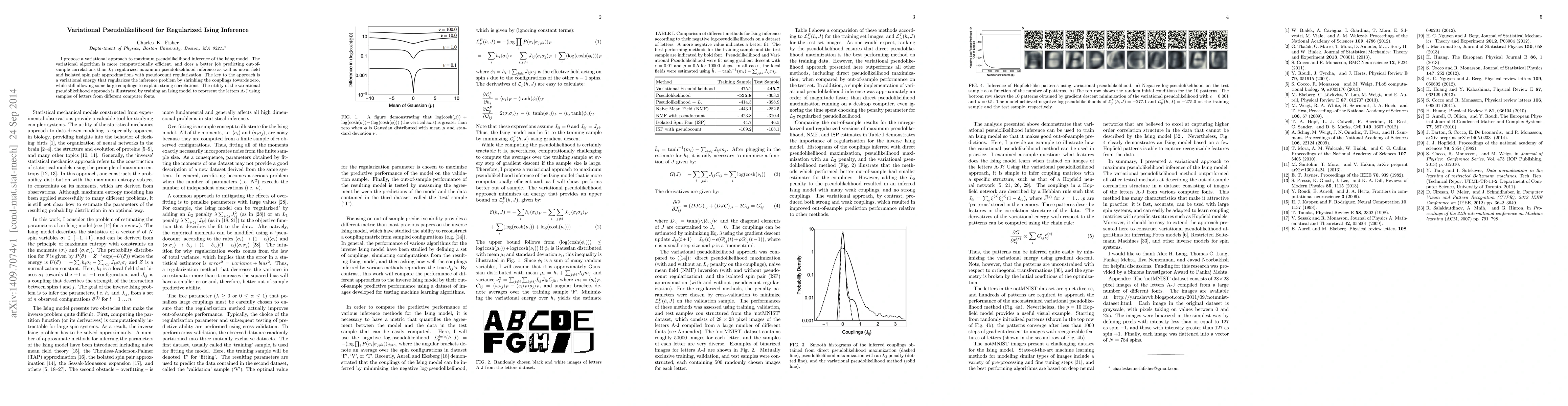 This paper proposes a variational pseudolikelihood approach for efficient inference of the Ising model, which outperforms $L_2$ regularization, mean field, and pseudocount methods in predicting out-of-sample correlations. The method uses a variational energy to shrink couplings while allowing significant ones to capture strong correlations, demonstrated through training an Ising model to represent letters A-J from various fonts.