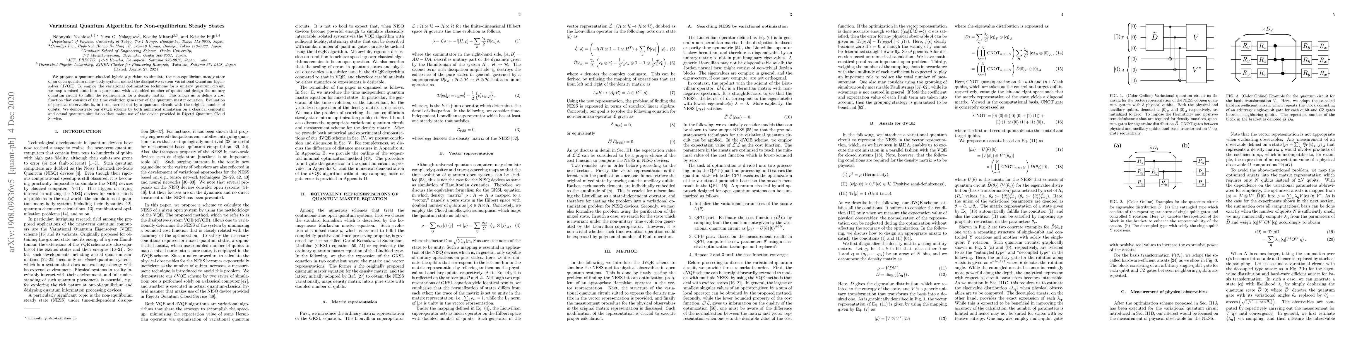 This paper introduces a hybrid quantum-classical algorithm called dissipative-system Variational Quantum Eigensolver (dVQE) to simulate non-equilibrium steady states in open quantum systems. The method maps mixed states into pure states using doubled qubits and employs variational optimization to evaluate the time evolution generator, demonstrating its effectiveness through both classical and quantum simulations.