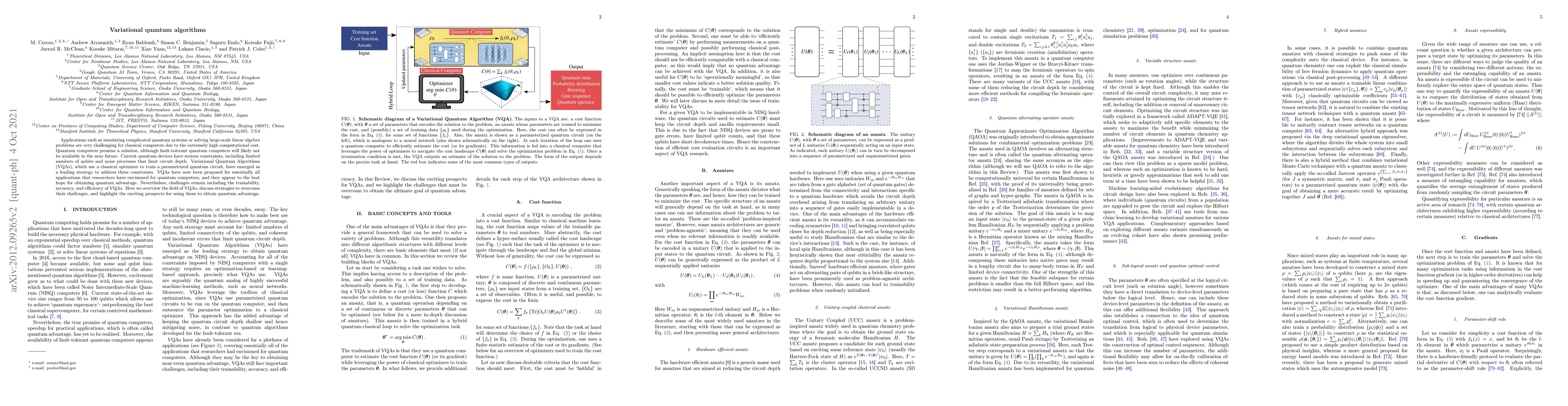 Variational Quantum Algorithms (VQAs) offer a promising solution to address constraints in quantum computing, allowing for efficient simulation of complicated systems and solving large-scale linear algebra problems. Despite challenges remaining, VQAs appear to be the best hope for obtaining quantum advantage and have been proposed for nearly all envisioned applications.