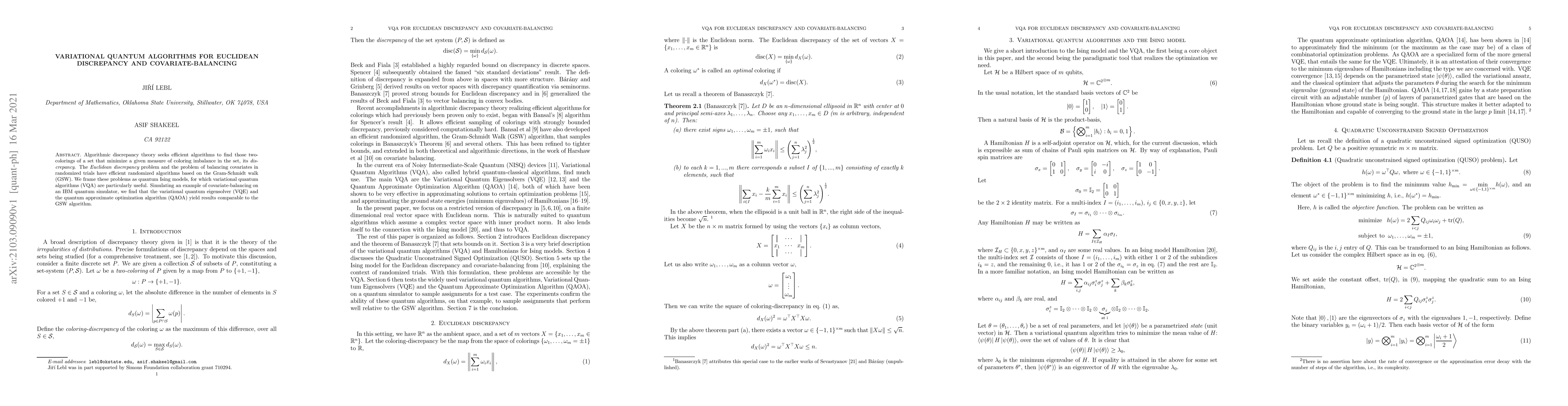 Algorithmic discrepancy theory seeks efficient algorithms to find those two-colorings of a set that minimize a given measure of coloring imbalance in the set, its {\it discrepancy}. The {\it Euclidean discrepancy} problem and the problem of balancing covariates in randomized trials have efficient randomized algorithms based on the Gram-Schmidt walk (GSW). We frame these problems as quantum Ising models, for which variational quantum algorithms (VQA) are particularly useful. Simulating an example of covariate-balancing on an IBM quantum simulator, we find that the variational quantum eigensolver (VQE) and the quantum approximate optimization algorithm (QAOA) yield results comparable to the GSW algorithm.
