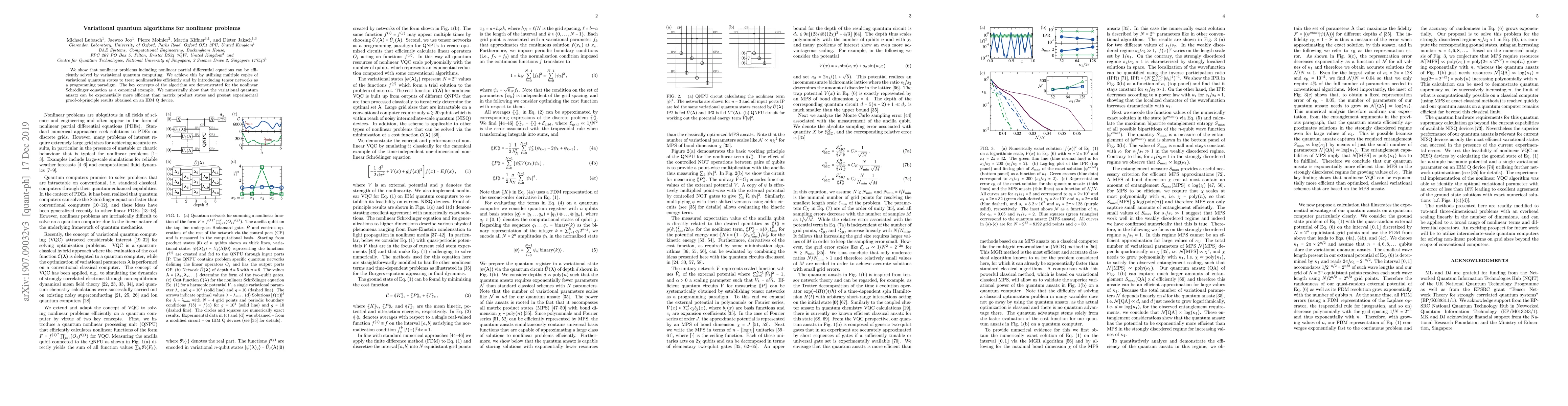 We show that nonlinear problems including nonlinear partial differential equations can be efficiently solved by variational quantum computing. We achieve this by utilizing multiple copies of variational quantum states to treat nonlinearities efficiently and by introducing tensor networks as a programming paradigm. The key concepts of the algorithm are demonstrated for the nonlinear Schr\"{o}dinger equation as a canonical example. We numerically show that the variational quantum ansatz can be exponentially more efficient than matrix product states and present experimental proof-of-principle results obtained on an IBM Q device.