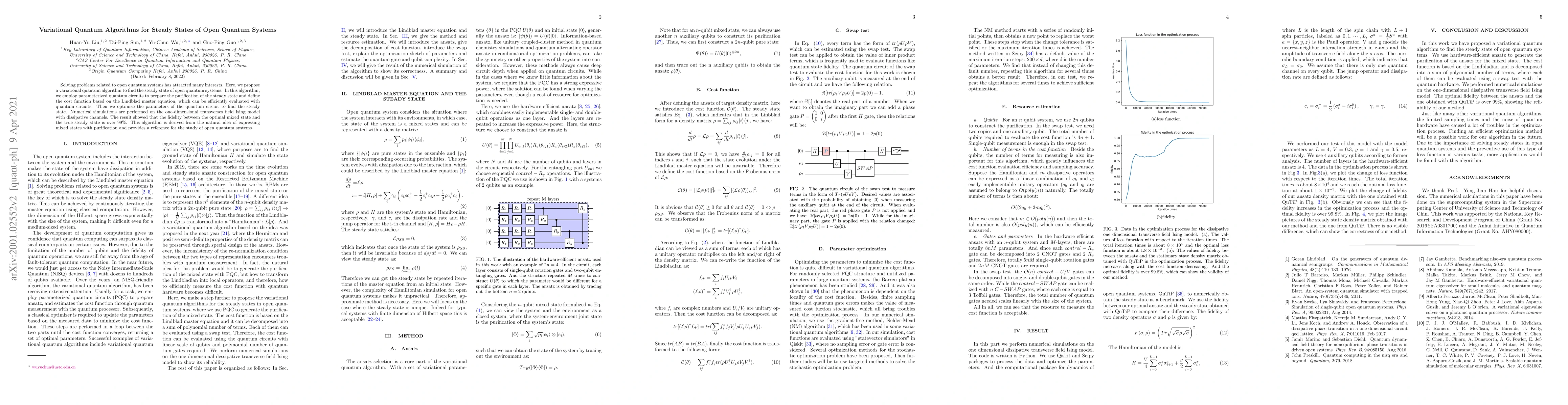This paper proposes a variational quantum algorithm to determine the steady state of open quantum systems using parameterized quantum circuits and a cost function based on the Lindblad master equation. Numerical simulations on the one-dimensional transverse field Ising model show a fidelity of over 99% between the optimal mixed state and the true steady state.