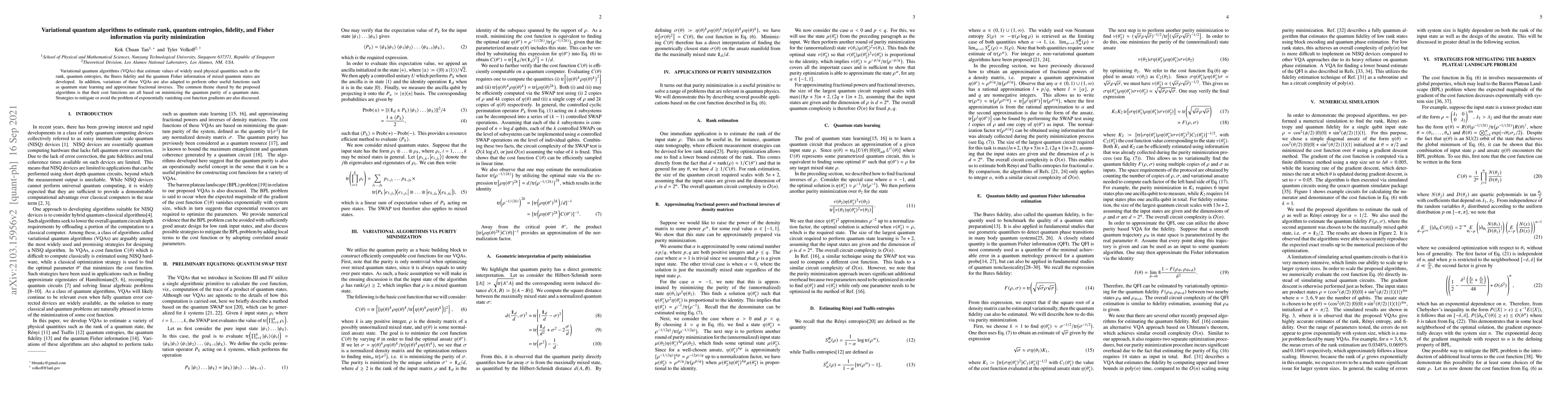 Summary: This paper introduces variational quantum algorithms to estimate rank, quantum entropies, fidelity, and Fisher information of mixed quantum states by minimizing quantum purity, and discusses strategies to tackle gradient vanishing issues. It also adapts these algorithms for quantum state learning and approximate fractional inverses.