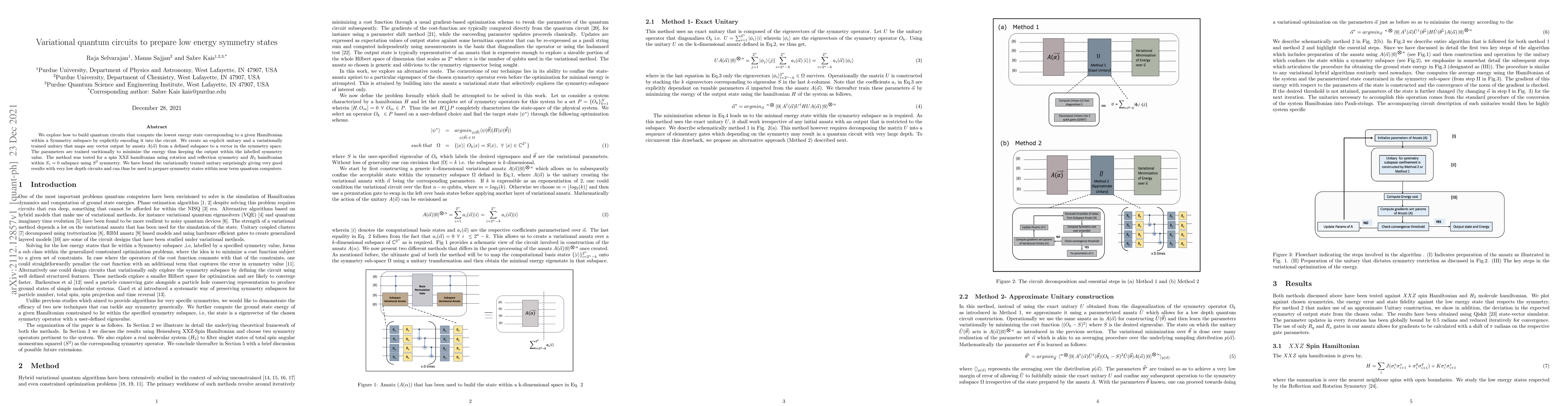 We explore how to build quantum circuits that compute the lowest energy state corresponding to a given Hamiltonian within a Symmetry subspace by explicitly encoding it into the circuit. We create an explicit unitary and a variationally trained unitary that maps any vector output by ansatz A(~{\alpha}) from a defined subspace to a vector in the symmetry space. The parameters are trained varitionally to minimize the energy thus keeping the output within the labelled symmetry value. The method was tested for a spin XXZ hamiltonian using rotation and reflection symmetry and H2 hamiltonian within S_z = 0 subspace using S^2 symmetry. We have found the variationally trained unitary surprisingly giving very good results with very low depth circuits and can thus be used to prepare symmetry states within near term quantum computers.