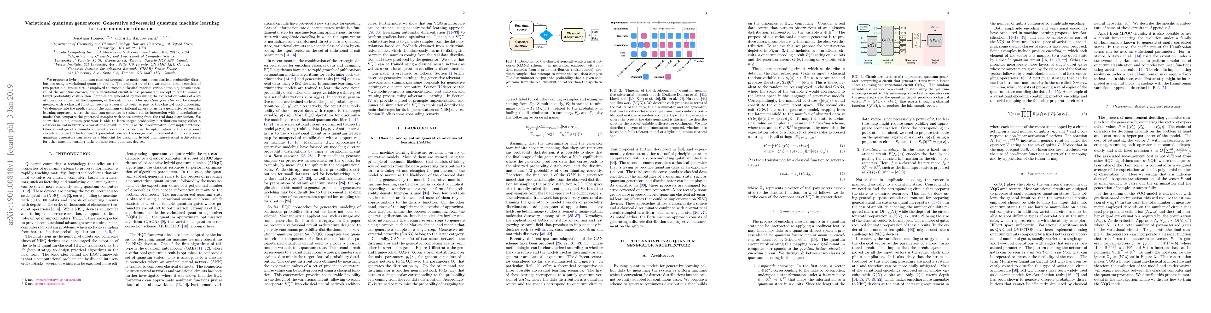 This paper proposes a hybrid quantum-classical method for modeling continuous probability distributions using variational quantum circuits. It employs a quantum encoder and a variational circuit optimized via generative adversarial learning, demonstrating the potential for quantum machine learning on near-term quantum devices.