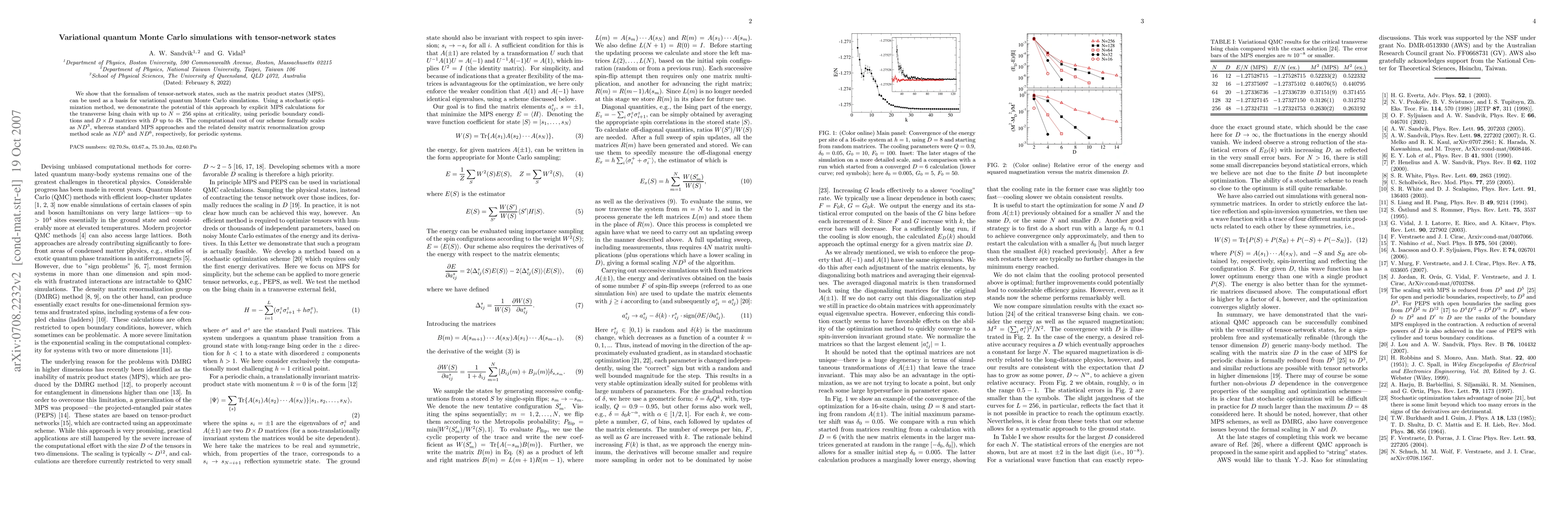 This paper demonstrates the application of tensor-network states, specifically matrix product states (MPS), in variational quantum Monte Carlo simulations, showing significant computational efficiency improvements over standard MPS and density matrix renormalization group methods. The approach is exemplified by MPS calculations on a transverse Ising chain with up to 256 spins.