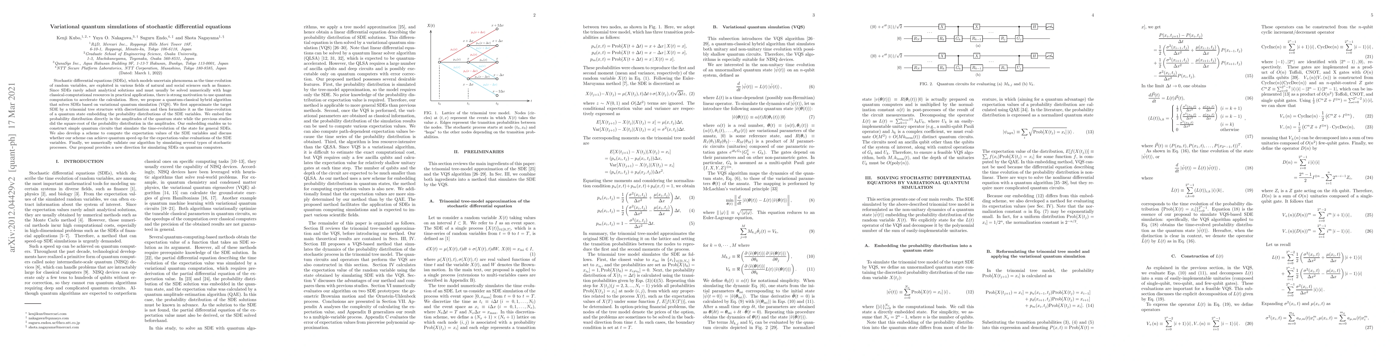 Stochastic differential equations (SDEs), which models uncertain phenomena as the time evolution of random variables, are exploited in various fields of natural and social sciences such as finance. Since SDEs rarely admit analytical solutions and must usually be solved numerically with huge classical-computational resources in practical applications, there is strong motivation to use quantum computation to accelerate the calculation. Here, we propose a quantum-classical hybrid algorithm that solves SDEs based on variational quantum simulation (VQS). We first approximate the target SDE by a trinomial tree structure with discretization and then formulate it as the time-evolution of a quantum state embedding the probability distributions of the SDE variables. We embed the probability distribution directly in the amplitudes of the quantum state while the previous studies did the square-root of the probability distribution in the amplitudes. Our embedding enables us to construct simple quantum circuits that simulate the time-evolution of the state for general SDEs. We also develop a scheme to compute the expectation values of the SDE variables and discuss whether our scheme can achieve quantum speed-up for the expectation-value evaluations of the SDE variables. Finally, we numerically validate our algorithm by simulating several types of stochastic processes. Our proposal provides a new direction for simulating SDEs on quantum computers.