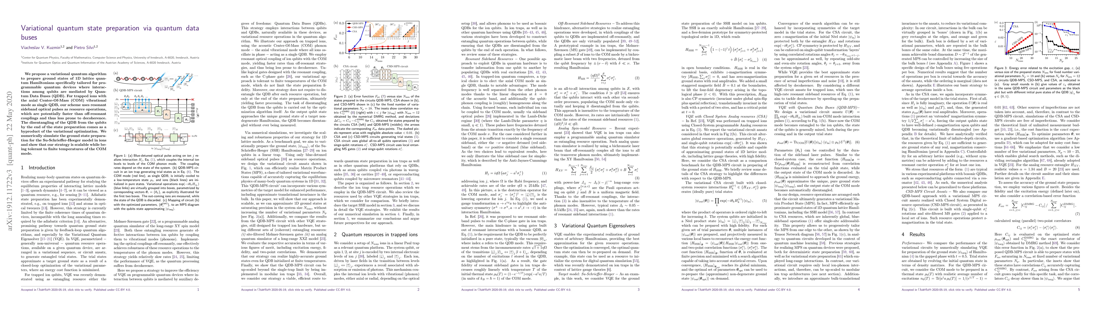 This paper proposes a variational quantum algorithm for preparing ground states of 1D lattice Hamiltonians using Quantum Data Buses (QDB) in programmable quantum devices. The method leverages resonant sideband optical pulses for faster, decoherence-resistant interactions, and demonstrates scalability and tolerance to finite temperatures through numerical simulations of the Su-Schrieffer-Heeger model in trapped ions.