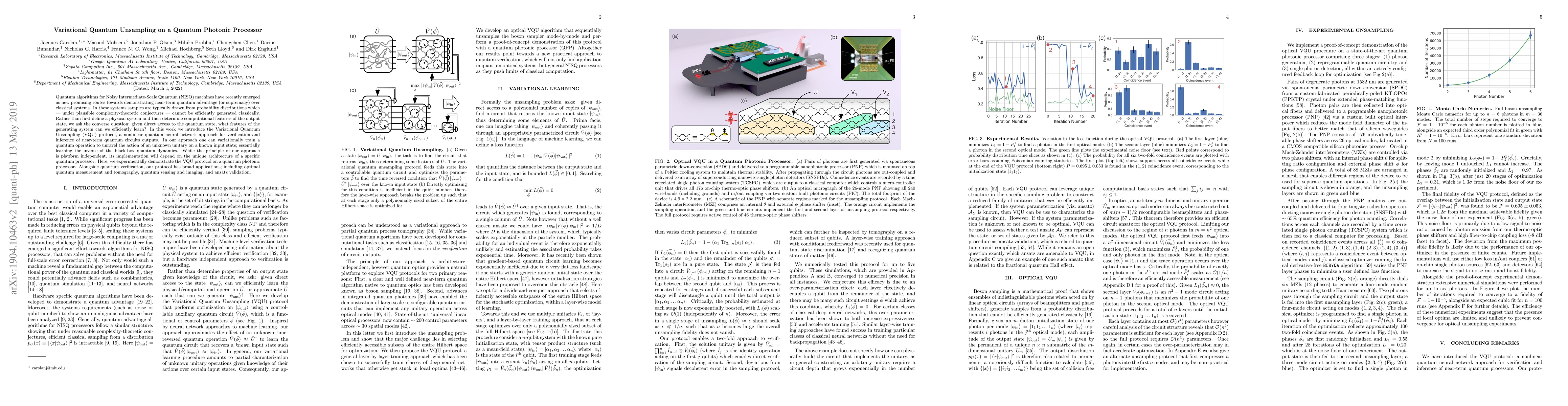Quantum algorithms for Noisy Intermediate-Scale Quantum (NISQ) machines have recently emerged as new promising routes towards demonstrating near-term quantum advantage (or supremacy) over classical systems. In these systems samples are typically drawn from probability distributions which --- under plausible complexity-theoretic conjectures --- cannot be efficiently generated classically. Rather than first define a physical system and then determine computational features of the output state, we ask the converse question: given direct access to the quantum state, what features of the generating system can we efficiently learn? In this work we introduce the Variational Quantum Unsampling (VQU) protocol, a nonlinear quantum neural network approach for verification and inference of near-term quantum circuits outputs. In our approach one can variationally train a quantum operation to unravel the action of an unknown unitary on a known input state; essentially learning the inverse of the black-box quantum dynamics. While the principle of our approach is platform independent, its implementation will depend on the unique architecture of a specific quantum processor. Here, we experimentally demonstrate the VQU protocol on a quantum photonic processor. Alongside quantum verification, our protocol has broad applications; including optimal quantum measurement and tomography, quantum sensing and imaging, and ansatz validation.