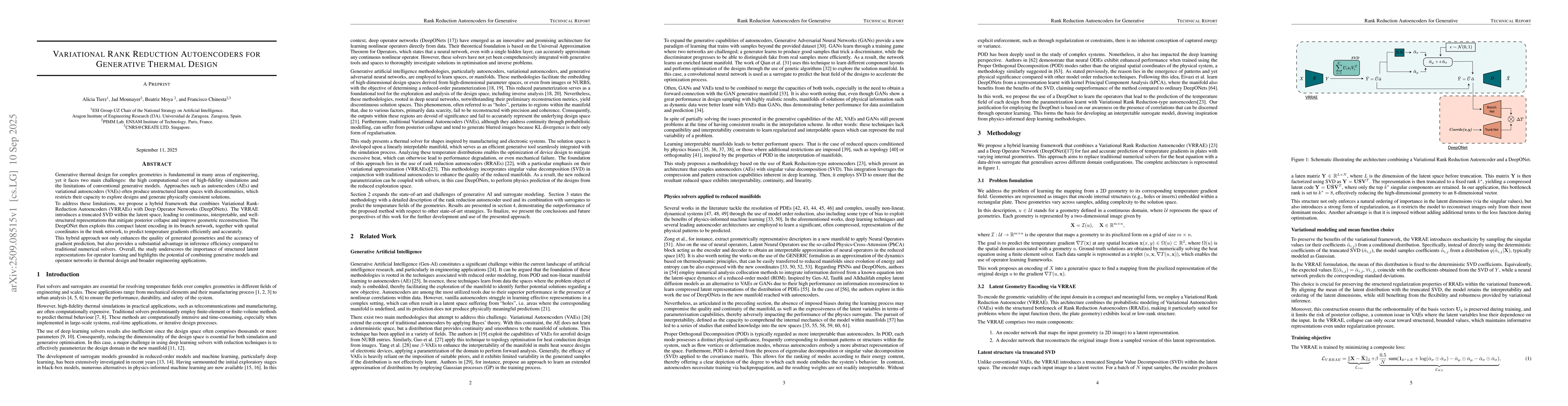 Generative thermal design for complex geometries is fundamental in many areas of engineering, yet it faces two main challenges: the high computational cost of high-fidelity simulations and the limitations of conventional generative models. Approaches such as autoencoders (AEs) and variational autoencoders (VAEs) often produce unstructured latent spaces with discontinuities, which restricts their capacity to explore designs and generate physically consistent solutions. To address these limitations, we propose a hybrid framework that combines Variational Rank-Reduction Autoencoders (VRRAEs) with Deep Operator Networks (DeepONets). The VRRAE introduces a truncated SVD within the latent space, leading to continuous, interpretable, and well-structured representations that mitigate posterior collapse and improve geometric reconstruction. The DeepONet then exploits this compact latent encoding in its branch network, together with spatial coordinates in the trunk network, to predict temperature gradients efficiently and accurately. This hybrid approach not only enhances the quality of generated geometries and the accuracy of gradient prediction, but also provides a substantial advantage in inference efficiency compared to traditional numerical solvers. Overall, the study underscores the importance of structured latent representations for operator learning and highlights the potential of combining generative models and operator networks in thermal design and broader engineering applications.