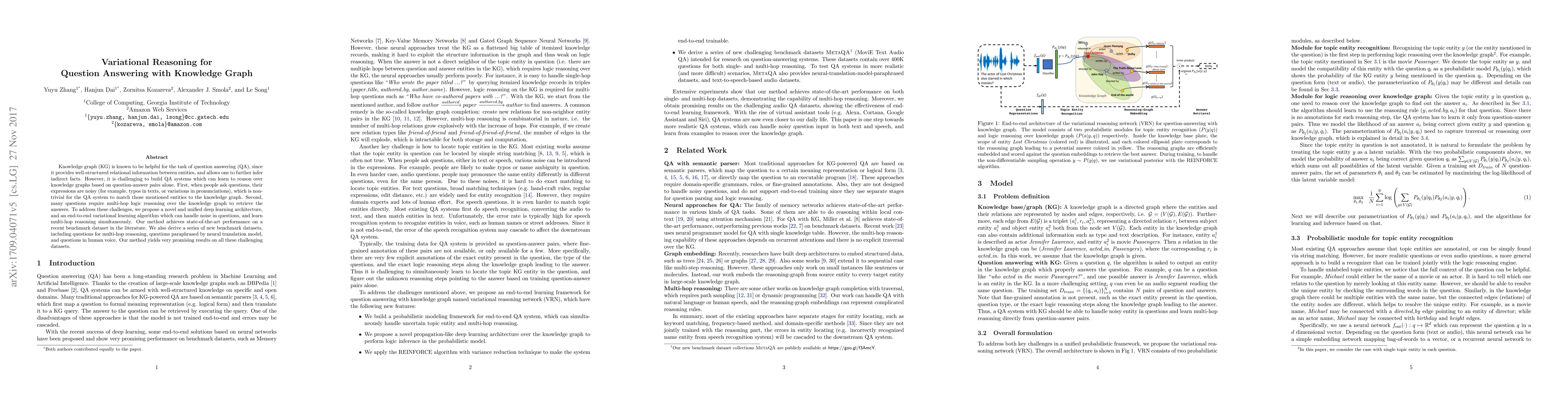 This paper proposes a novel deep learning architecture and variational learning algorithm for question answering that leverages knowledge graphs. The method effectively handles noisy question inputs and multi-hop reasoning, achieving state-of-the-art performance on benchmark datasets, including new datasets for multi-hop reasoning and paraphrased questions.
