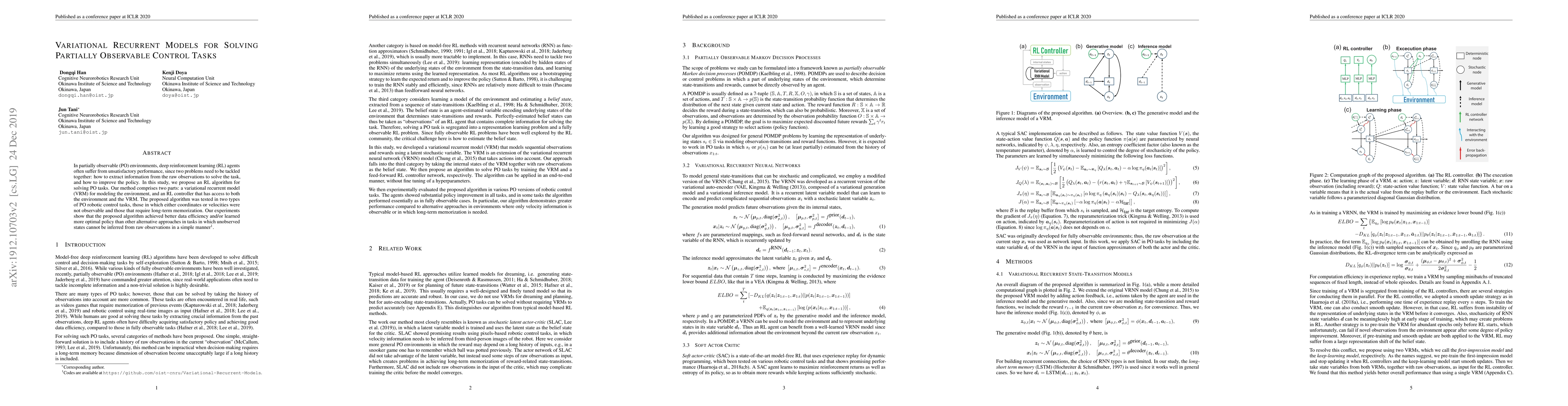 In partially observable (PO) environments, deep reinforcement learning (RL) agents often suffer from unsatisfactory performance, since two problems need to be tackled together: how to extract information from the raw observations to solve the task, and how to improve the policy. In this study, we propose an RL algorithm for solving PO tasks. Our method comprises two parts: a variational recurrent model (VRM) for modeling the environment, and an RL controller that has access to both the environment and the VRM. The proposed algorithm was tested in two types of PO robotic control tasks, those in which either coordinates or velocities were not observable and those that require long-term memorization. Our experiments show that the proposed algorithm achieved better data efficiency and/or learned more optimal policy than other alternative approaches in tasks in which unobserved states cannot be inferred from raw observations in a simple manner.