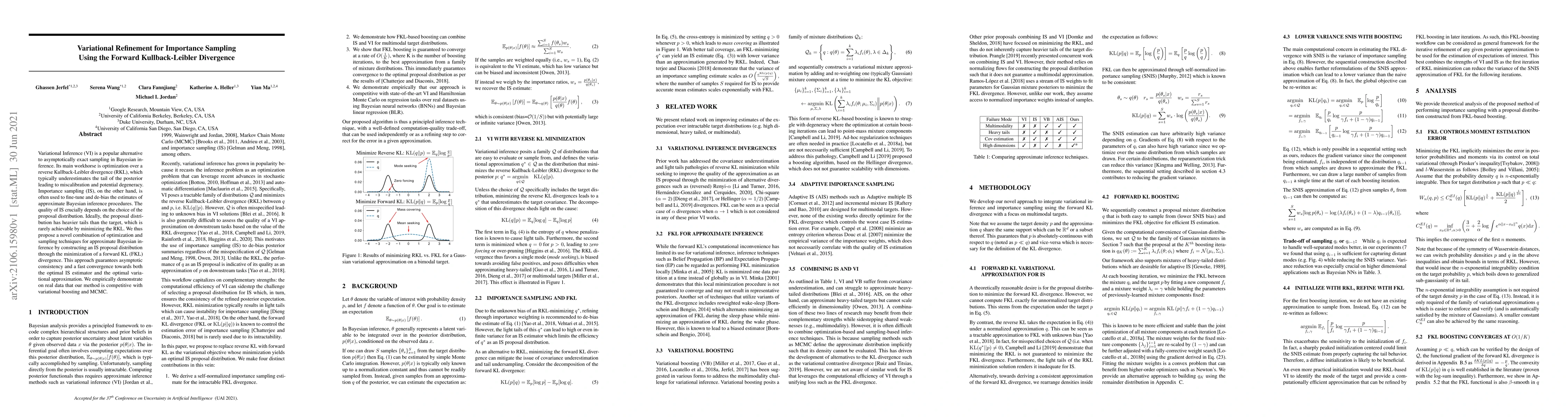 This paper proposes a novel variational refinement method for importance sampling using the forward Kullback-Leibler divergence to improve Bayesian inference. It combines optimization and sampling techniques to achieve better calibration and convergence compared to traditional variational inference methods.