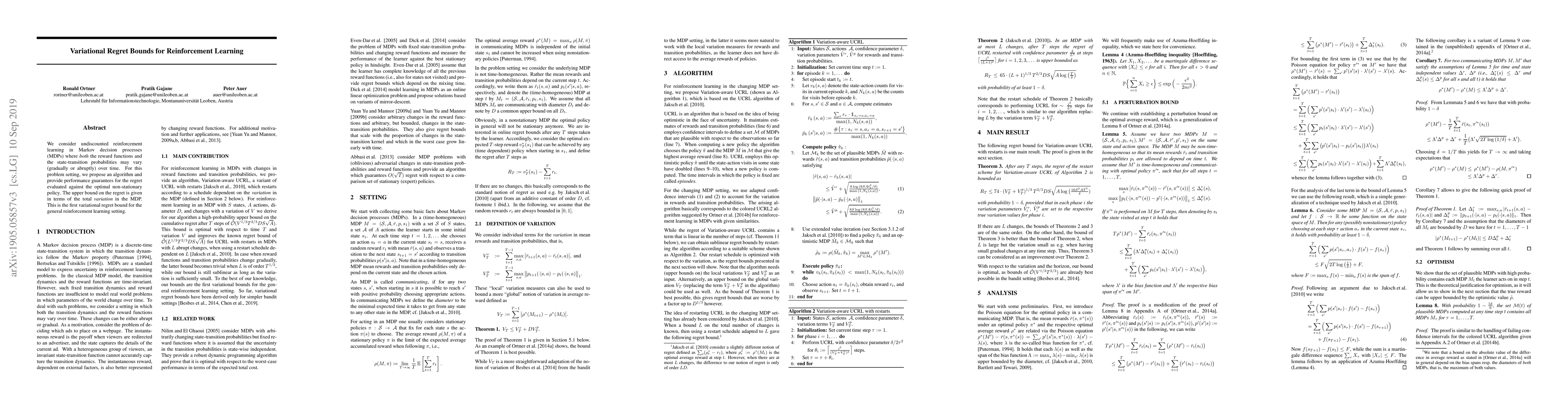 This paper proposes an algorithm for undiscounted reinforcement learning in non-stationary Markov decision processes, providing the first variational regret bound that relates regret to the total variation in the MDP. The algorithm offers performance guarantees against the optimal non-stationary policy.