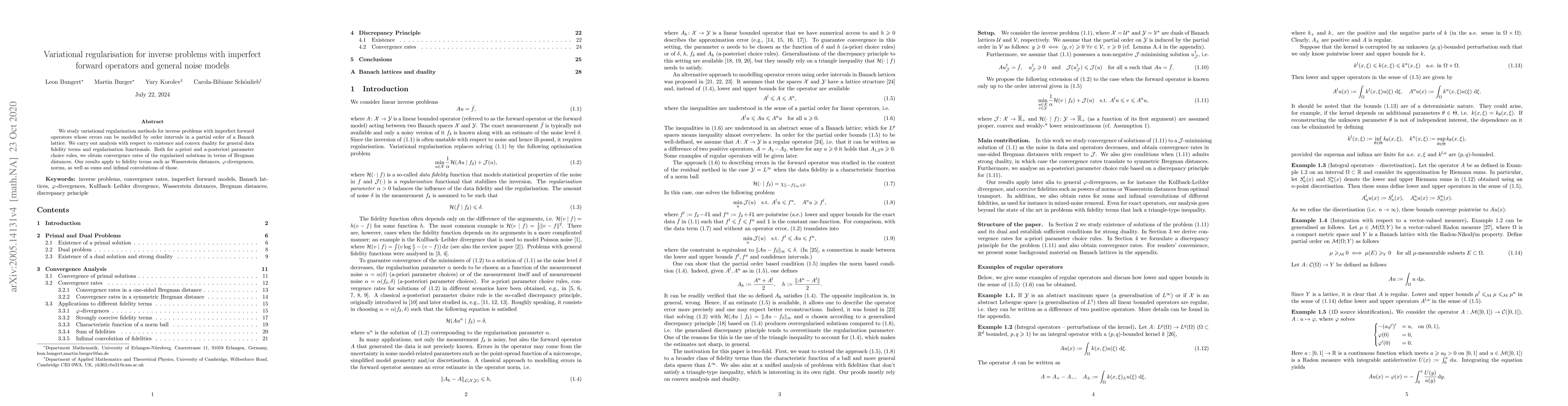 This paper investigates variational regularisation techniques for inverse problems where the forward operators are imperfect, modeled by order intervals in a Banach lattice. It provides existence and convex duality analysis for general noise models, achieving convergence rates for both a-priori and a-posteriori parameter selection methods using Bregman distances.