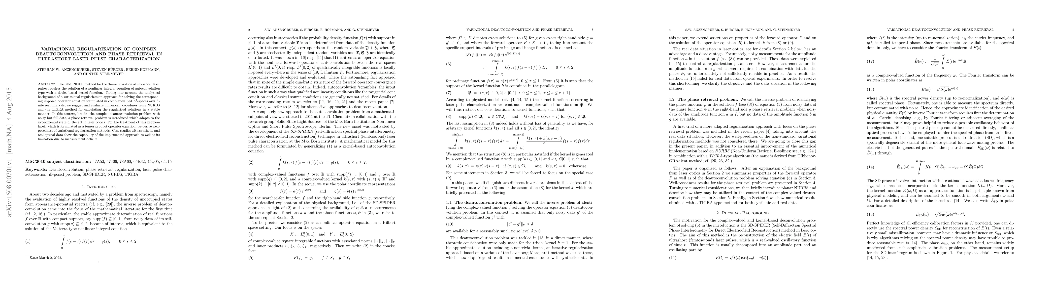 Researchers developed a new method to accurately characterize ultrashort laser pulses using variational regularization of complex deautoconvolution and phase retrieval problems. This approach improves the stability and accuracy of pulse characterization in optical experiments.