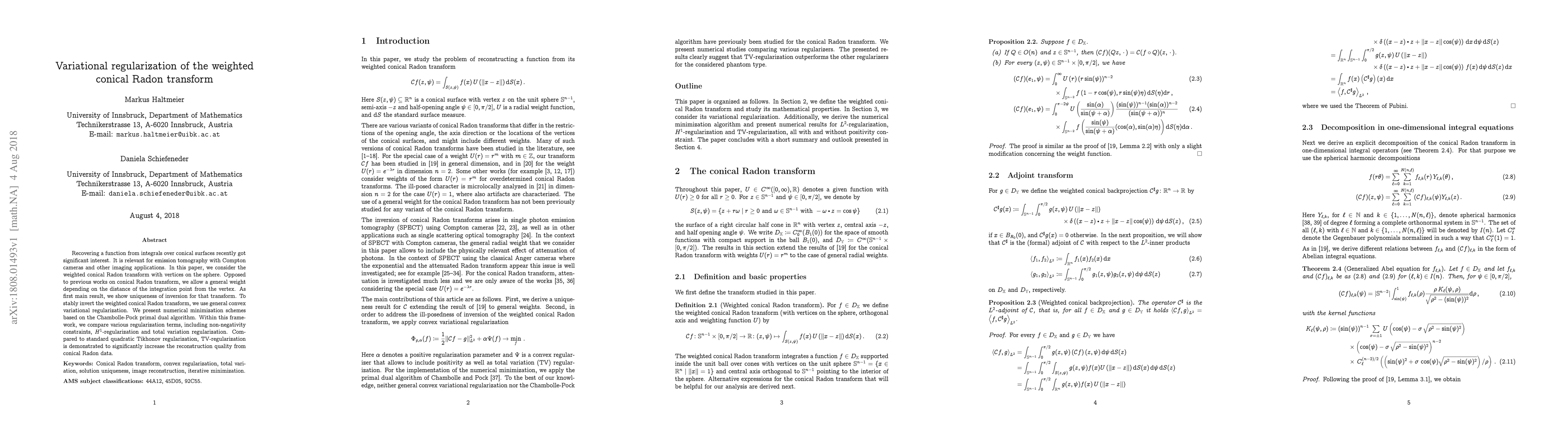 This paper explores the inversion of the weighted conical Radon transform, which is crucial for advanced imaging techniques like emission tomography. It introduces a general weight function and proves the uniqueness of the inversion, employing convex variational regularization for stable reconstruction. The study demonstrates that total variation regularization outperforms standard methods, enhancing the quality of reconstructions from conical Radon data.