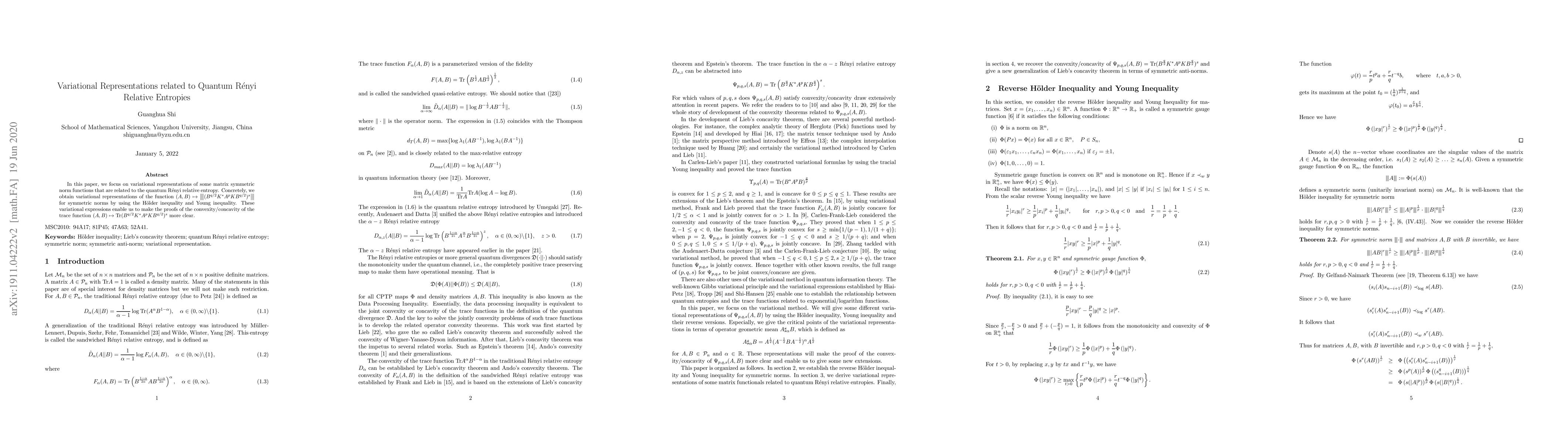Researchers developed variational representations for matrix symmetric norm functions related to quantum Rényi relative entropy, enabling clearer proofs of convexity/concavity of specific trace function expressions.