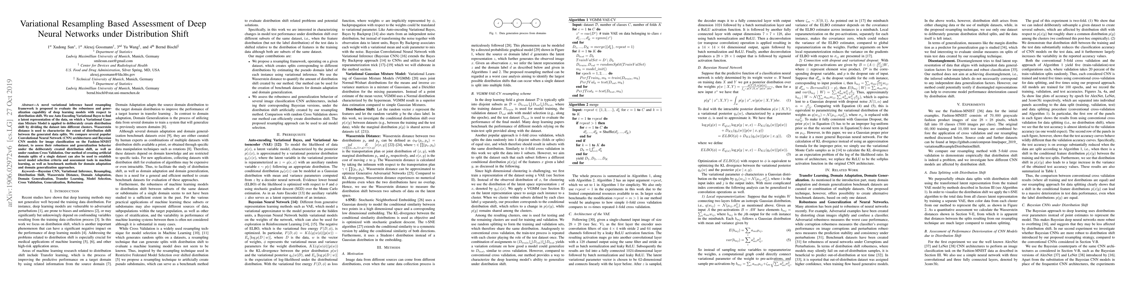 This paper proposes a variational inference-based resampling method to evaluate deep neural networks' robustness and generalization under distribution shift. It uses Auto Encoding Variational Bayes and a Variational Gaussian Mixture Model to create artificial distribution shifts and assesses CNNs' performance on the Fashion-MNIST dataset.
