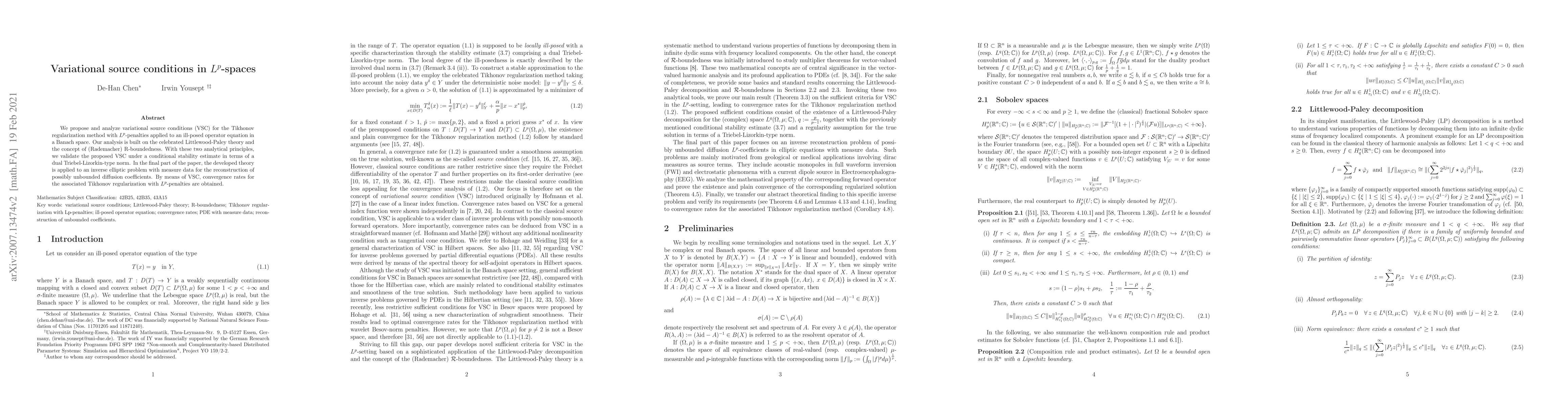 We propose and analyze variational source conditions (VSC) for the Tikhonov regularization method with Lp-norm penalties for a general ill-posed operator equation in a Banach space. Our analysis is based on the use of the celebrated Littlewood-Paley theory and the concept of (Rademacher) R-boundedness. On the basis of these two analytical tools, we validate the proposed VSC under a conditional stability estimate and a regularity requirement of the true solution in terms of Triebel-Lizorkin-type spaces. In the final part of the paper, the developed theory is applied to an inverse elliptic problem with measure data for the reconstruction of possibly unbounded diffusion coefficients in the Lp-setting. By means of VSC, convergence rates for the associated Tikhonov regularization with Lp-norm penalties are obtained.