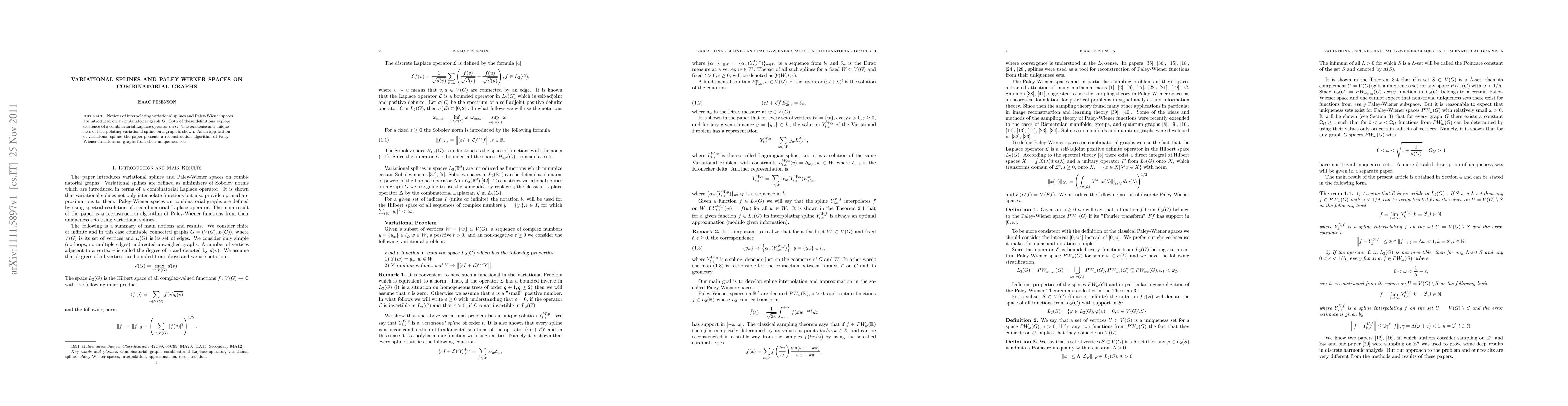 This paper introduces variational splines and Paley-Wiener spaces on combinatorial graphs, demonstrating the existence and uniqueness of splines and presenting a reconstruction algorithm for Paley-Wiener functions using these splines.