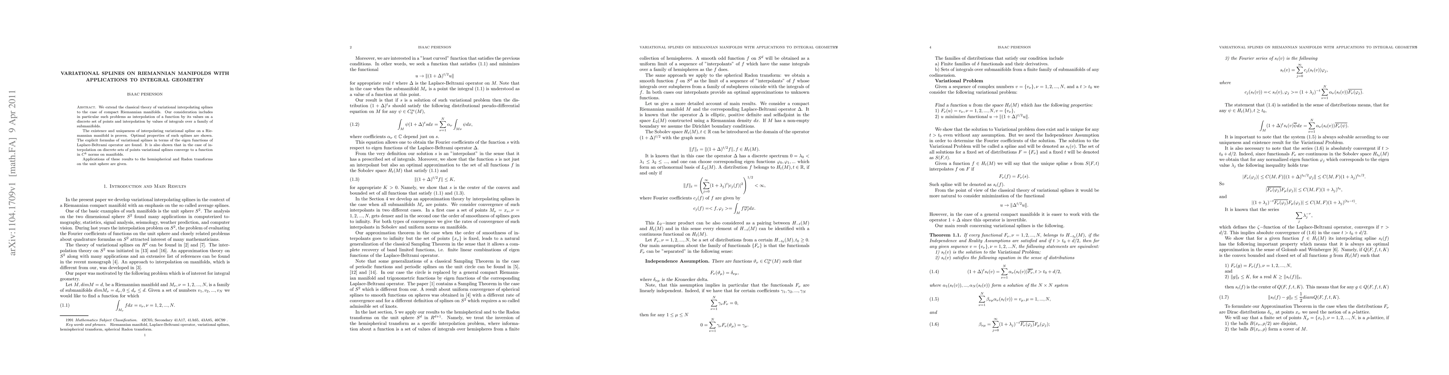 We extend the classical theory of variational interpolating splines to the case of compact Riemannian manifolds. Our consideration includes in particular such problems as interpolation of a function by its values on a discrete set of points and interpolation by values of integrals over a family of submanifolds. The existence and uniqueness of interpolating variational spline on a Riemannian manifold is proven. Optimal properties of such splines are shown. The explicit formulas of variational splines in terms of the eigen functions of Laplace-Beltrami operator are found. It is also shown that in the case of interpolation on discrete sets of points variational splines converge to a function in $C^{k}$ norms on manifolds. Applications of these results to the hemispherical and Radon transforms on the unit sphere are given.