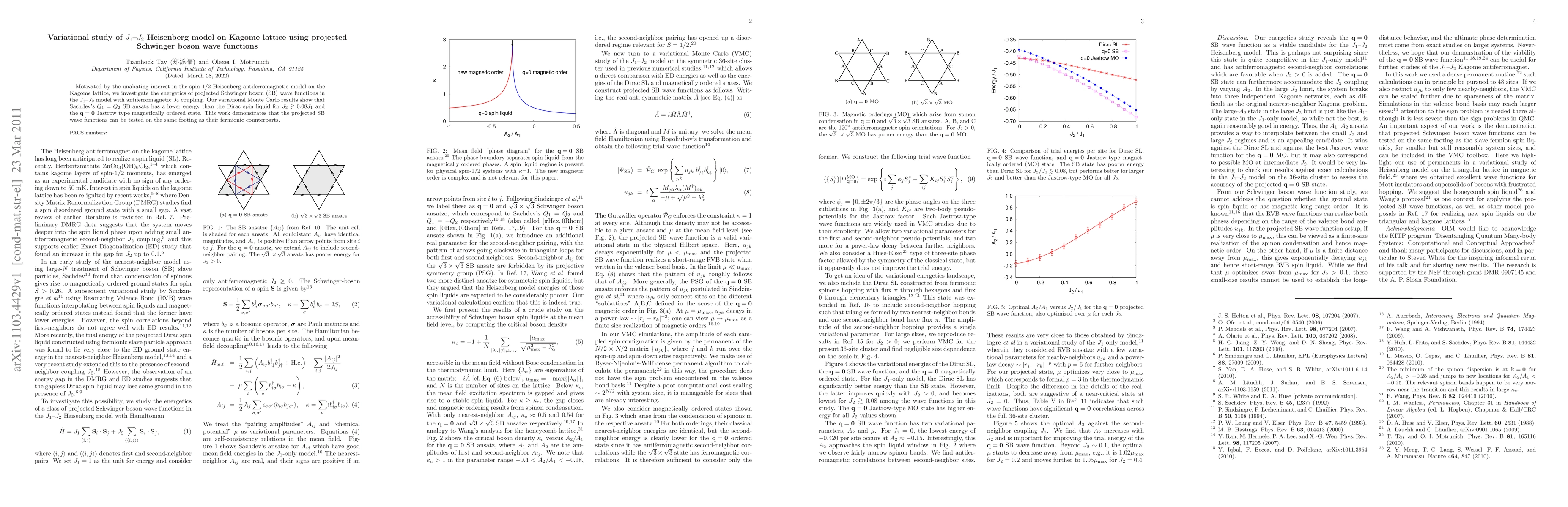 A study investigates the energetics of projected Schwinger boson wave functions in a J1-J2 Heisenberg model on Kagome lattice, finding that certain wave functions have lower energy than others for specific coupling strengths.