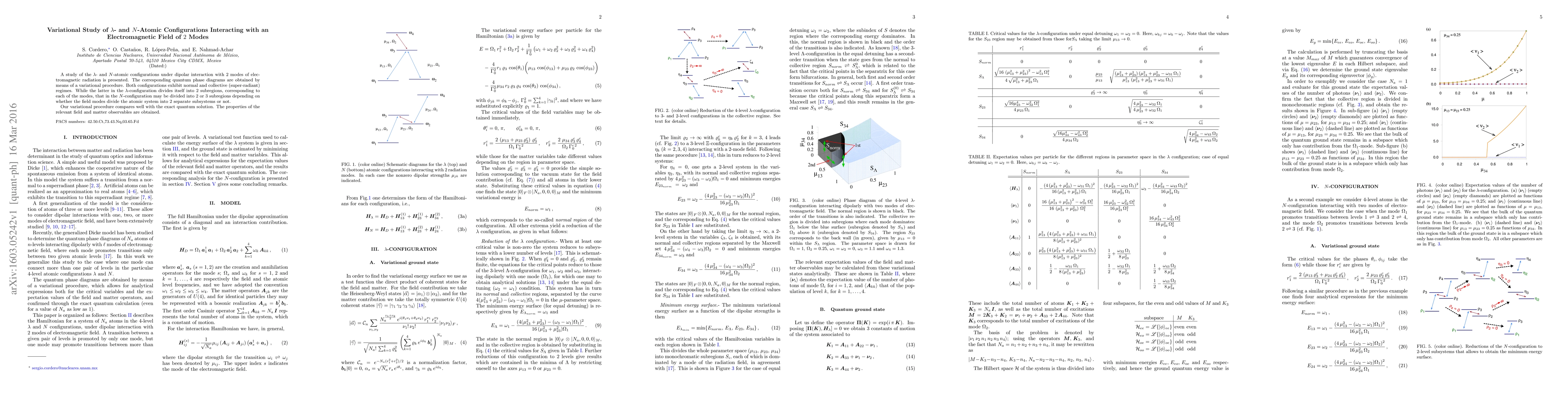 A study of the $\lambda$- and $N$-atomic configurations under dipolar interaction with $2$ modes of electromagnetic radiation is presented. The corresponding quantum phase diagrams are obtained by means of a variational procedure. Both configurations exhibit normal and collective (super-radiant) regimes. While the latter in the $\lambda$-configuration divides itself into $2$ subregions, corresponding to each of the modes, that in the $N$-configuration may be divided into $2$ or $3$ subregions depending on whether the field modes divide the atomic system into $2$ separate subsystems or not. Our variational procedure compares well with the exact quantum solution. The properties of the relevant field and matter observables are obtained.