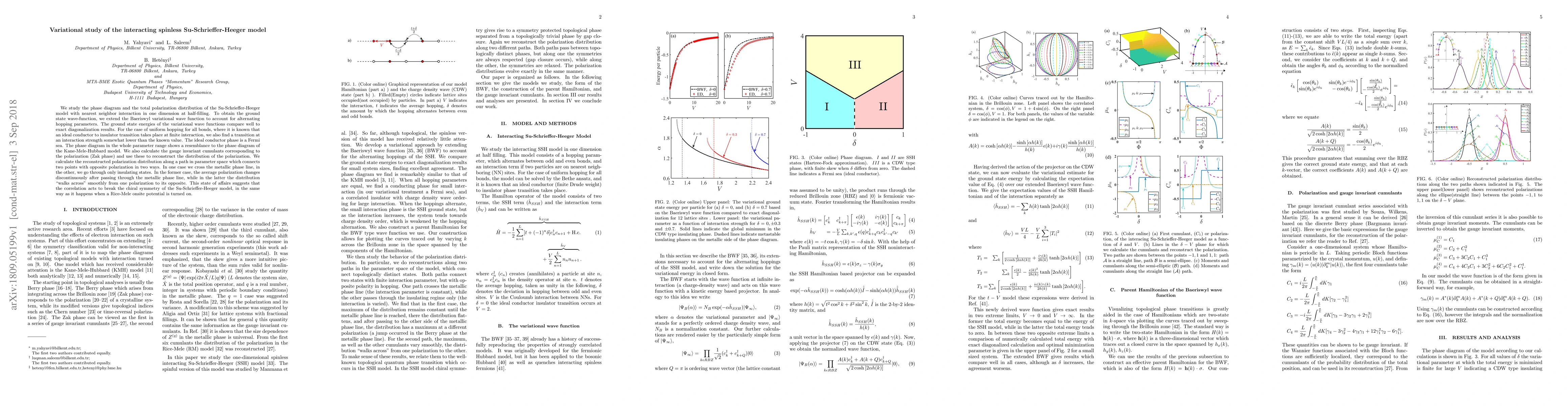 We study the phase diagram and the total polarization distribution of the Su-Schrieffer-Heeger model with nearest neighbor interaction in one dimension at half-filling. To obtain the ground state wave-function, we extend the Baeriswyl variational wave function to account for alternating hopping parameters. The ground state energies of the variational wave functions compare well to exact diagonalization results. For the case of uniform hopping for all bonds, where it is known that an ideal conductor to insulator transition takes place at finite interaction, we also find a transition at an interaction strength somewhat lower than the known value. The ideal conductor phase is a Fermi sea. The phase diagram in the whole parameter range shows a resemblance to the phase diagram of the Kane-Mele-Hubbard model. We also calculate the gauge invariant cumulants corresponding to the polarization (Zak phase) and use these to reconstruct the distribution of the polarization. We calculate the reconstructed polarization distribution along a path in parameter space which connects two points with opposite polarization in two ways. In one case we cross the metallic phase line, in the other, we go through only insulating states. In the former case, the average polarization changes discontinuously after passing through the metallic phase line, while in the latter the distribution "walks across" smoothly from one polarization to its opposite. This state of affairs suggests that the correlation acts to break the chiral symmetry of the Su-Schrieffer-Heeger model, in the same way as it happens when a Rice-Mele onsite potential is turned on.