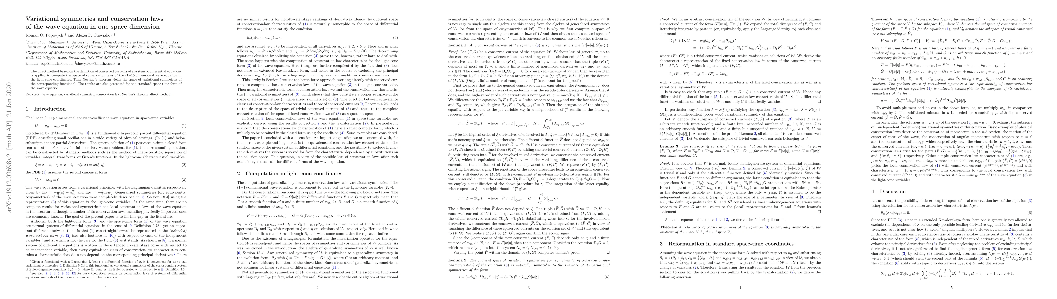 This research applies the direct method and Noether's theorem to compute conserved currents and variational symmetries of the (1+1)-dimensional wave equation in both light-cone and standard space-time coordinates.