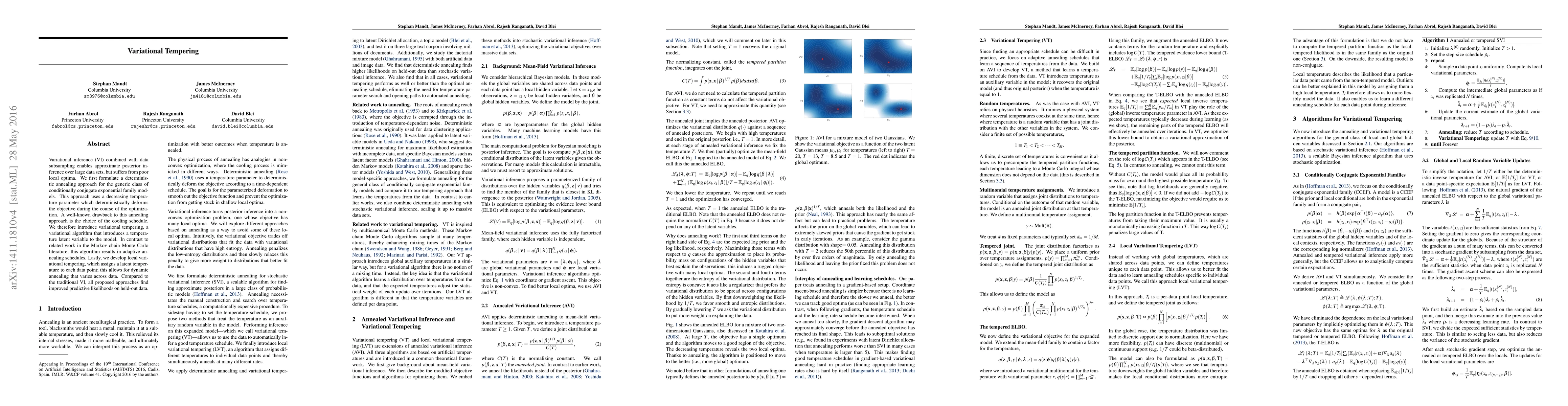 This paper introduces variational tempering, a method to improve variational inference (VI) by adaptively adjusting the temperature parameter during optimization, leading to better local optima and improved predictive performance on large datasets. The approach includes local variational tempering for dynamic annealing across data points.