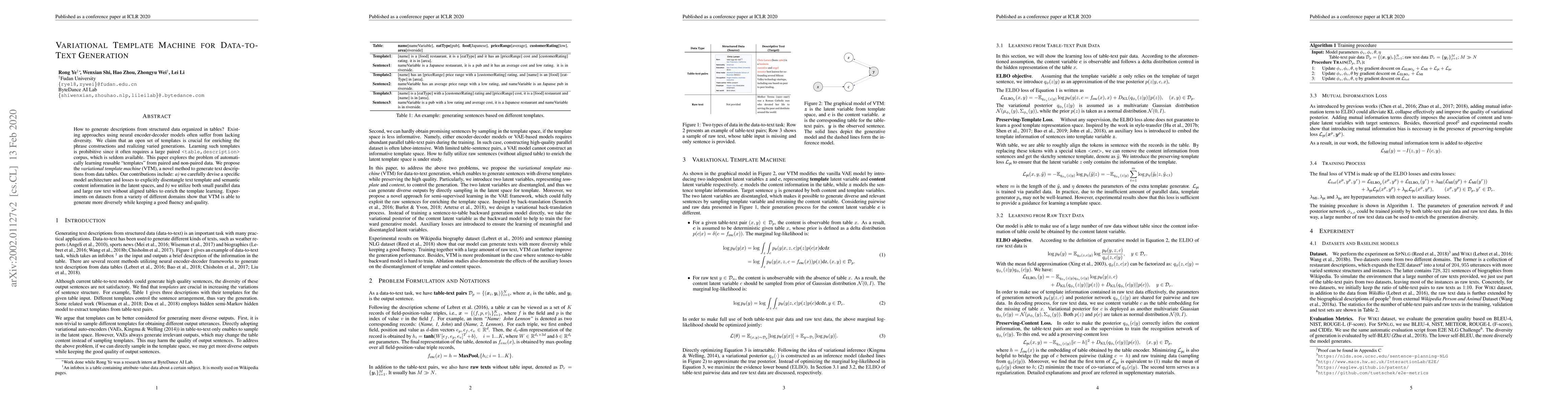 The Variational Template Machine (VTM) generates diverse text descriptions from structured data tables by learning reusable templates from paired and non-paired data, improving upon existing approaches with better fluency and quality.