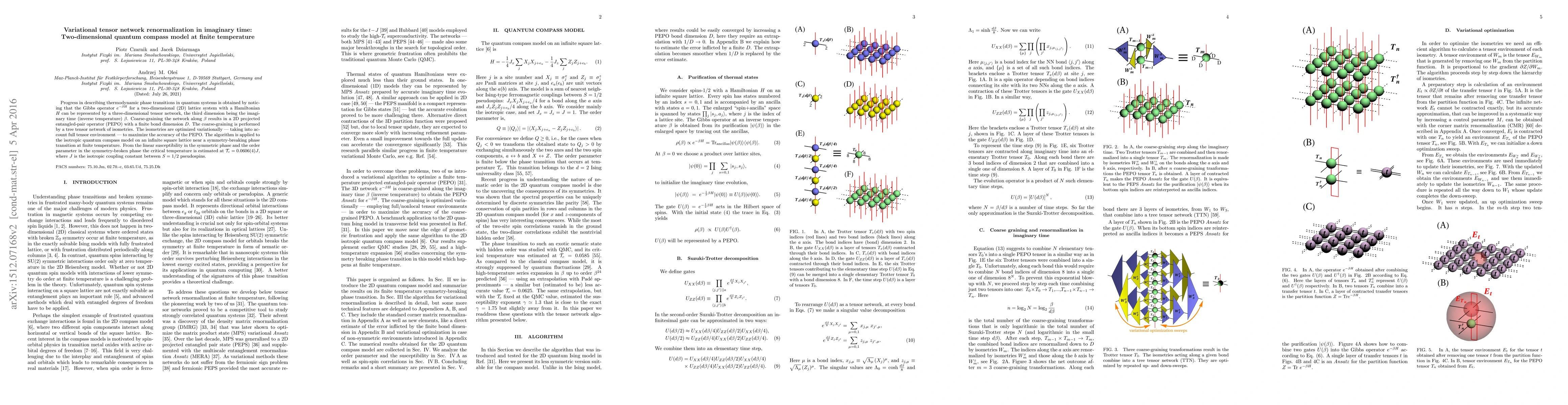 Progress in describing thermodynamic phase transitions in quantum systems is obtained by noticing that the Gibbs operator $e^{-\beta H}$ for a two-dimensional (2D) lattice system with a Hamiltonian $H$ can be represented by a three-dimensional tensor network, the third dimension being the imaginary time (inverse temperature) $\beta$. Coarse-graining the network along $\beta$ results in a 2D projected entangled-pair operator (PEPO) with a finite bond dimension $D$. The coarse-graining is performed by a tree tensor network of isometries. The isometries are optimized variationally --- taking into account full tensor environment --- to maximize the accuracy of the PEPO. The algorithm is applied to the isotropic quantum compass model on an infinite square lattice near a symmetry-breaking phase transition at finite temperature. From the linear susceptibility in the symmetric phase and the order parameter in the symmetry-broken phase the critical temperature is estimated at ${\cal T}_c=0.0606(4)J$, where $J$ is the isotropic coupling constant between $S=1/2$ pseudospins.
